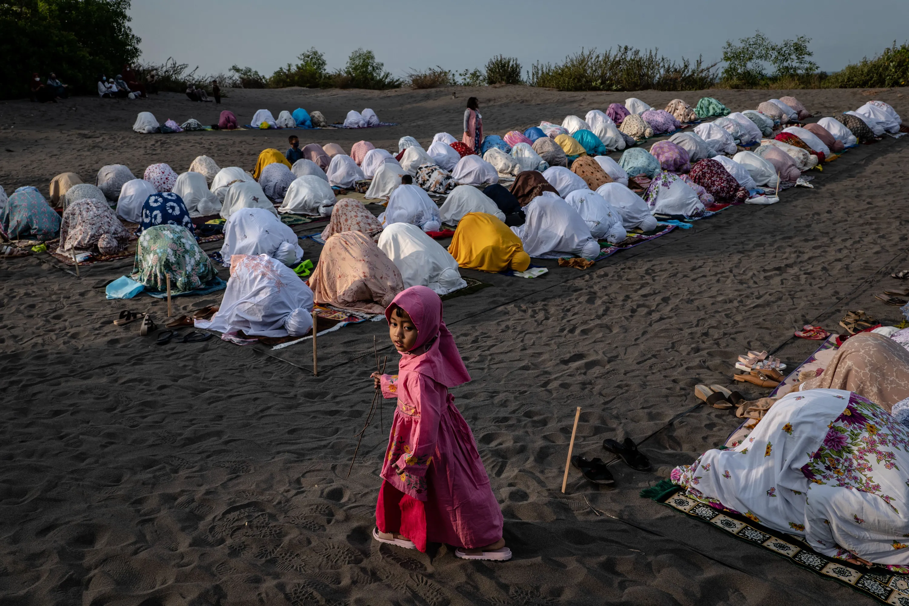 Indonesian muslims perform an Eid Al-Fitr prayer on the “sea of sands” at Grogol village on May 13, 2021 in Yogyakarta, Indonesia. Eid al-Fitr marks the end of Ramadan, during which Muslims in countries around the world spend time with family, offer gifts and often give to charity. The Indonesian government has banned domestic travel to prevent the spread of COVID-19, preventing people from returning home for festivities. (Photo by Ulet Ifansasti/Getty Images)