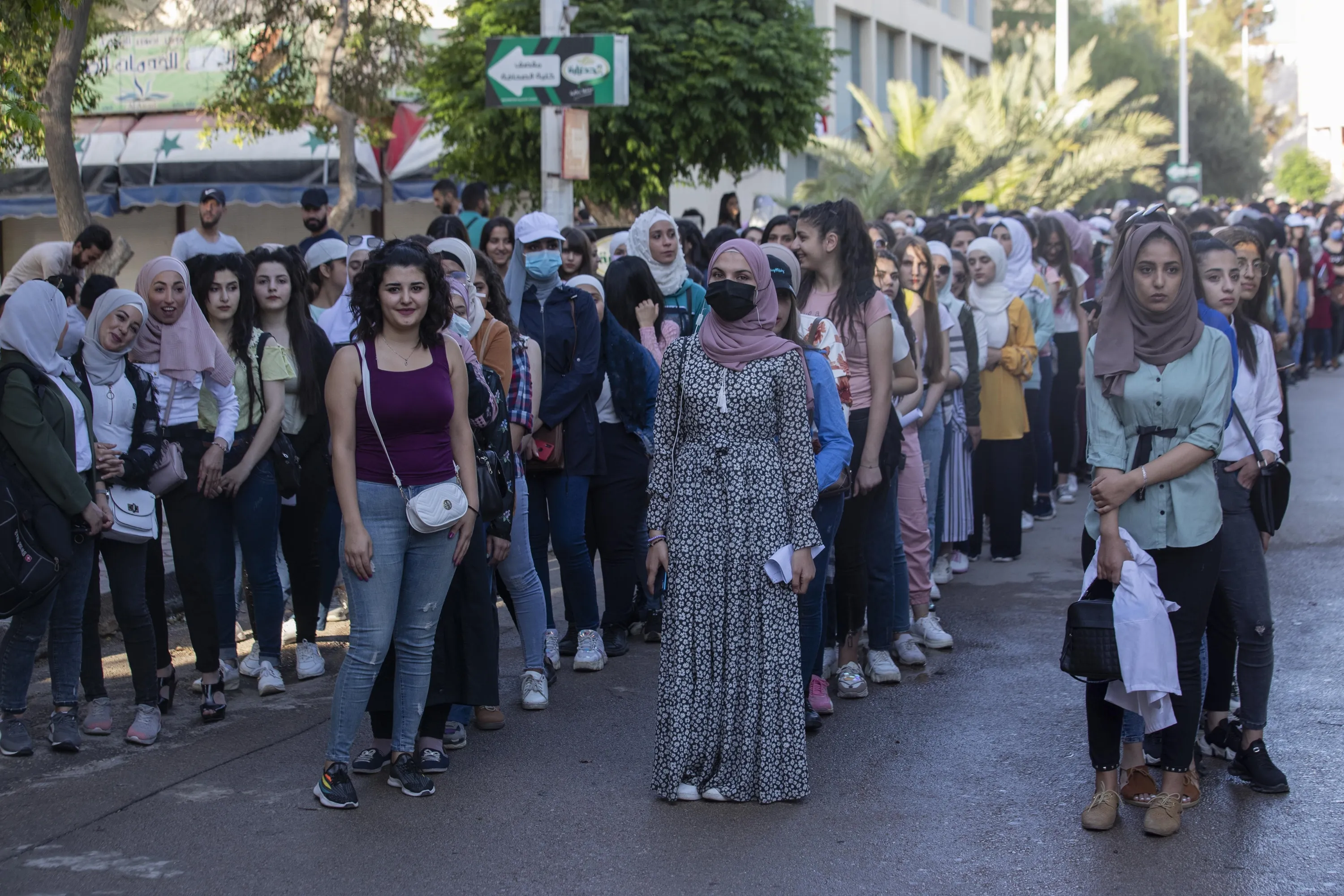 Syrian students attend to votes at a polling station during the Presidential elections in the Syrian capital Damascus, Syria, Wednesday, May 26, 2021. (Photo by Hassan Ammar/AP Photo)