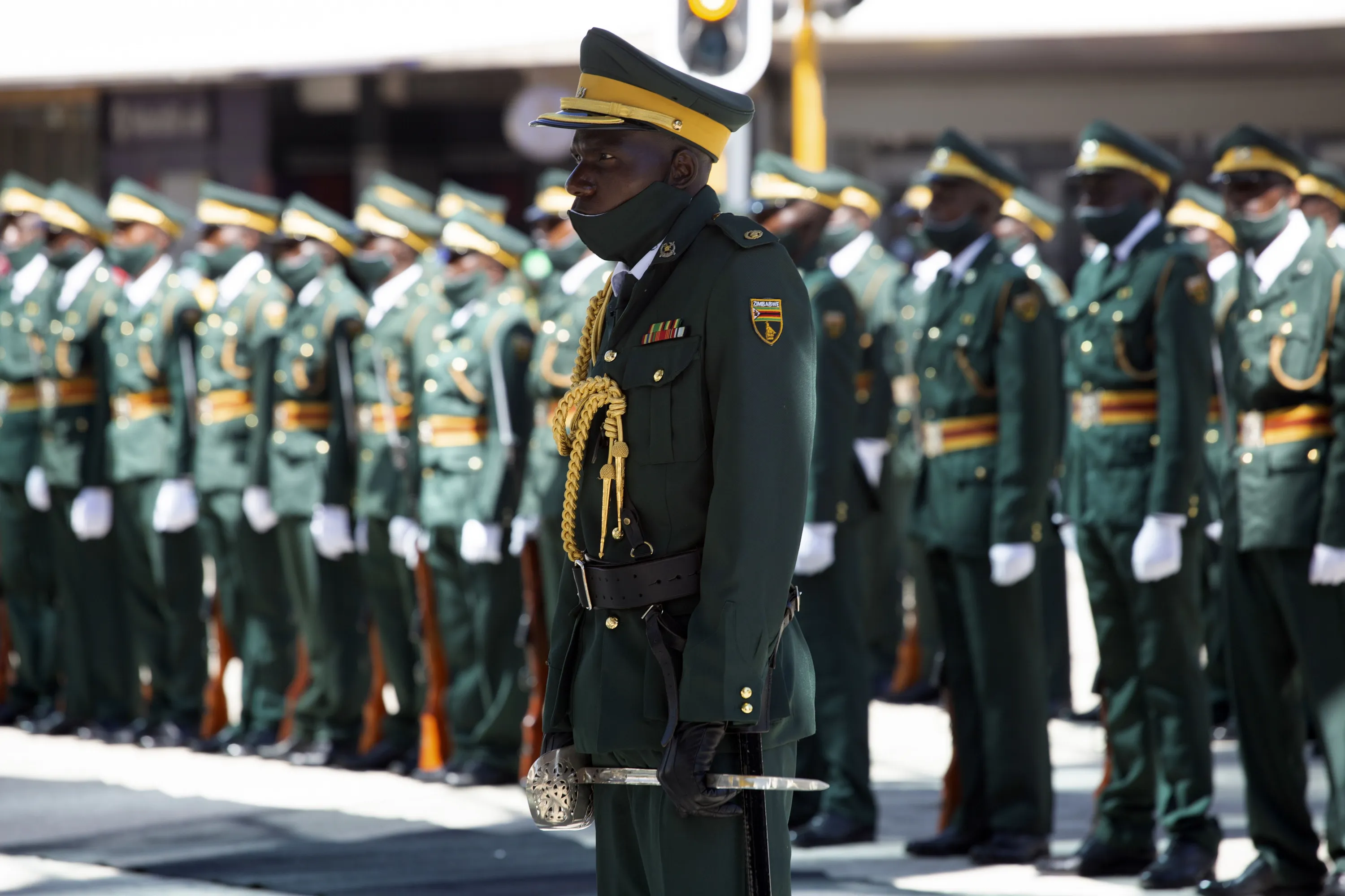 A member of the presidential guard stands guard during the unveiling of the statue of Charwe Nyakasikana in Harare, Tuesday, May, 25, 2021. (Photo by Tsvangirayi Mukwazhi/AP Photo)