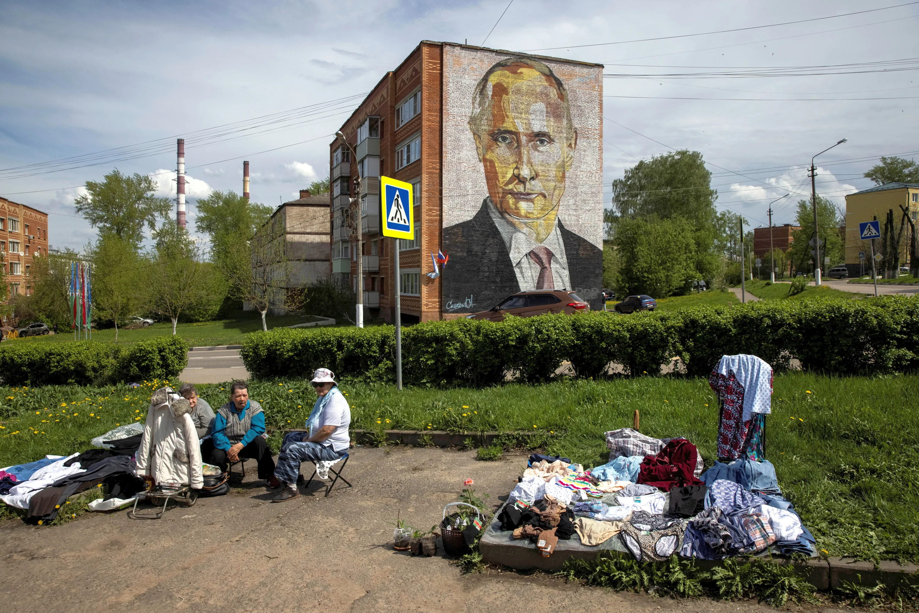 Street vendors sell clothes and flowers near a block of flats with a mural depicting Russian President Vladimir Putin in the town of Kashira in Moscow Region, Russia on May 15, 2021. (Photo by Maxim Shemetov/Reuters)