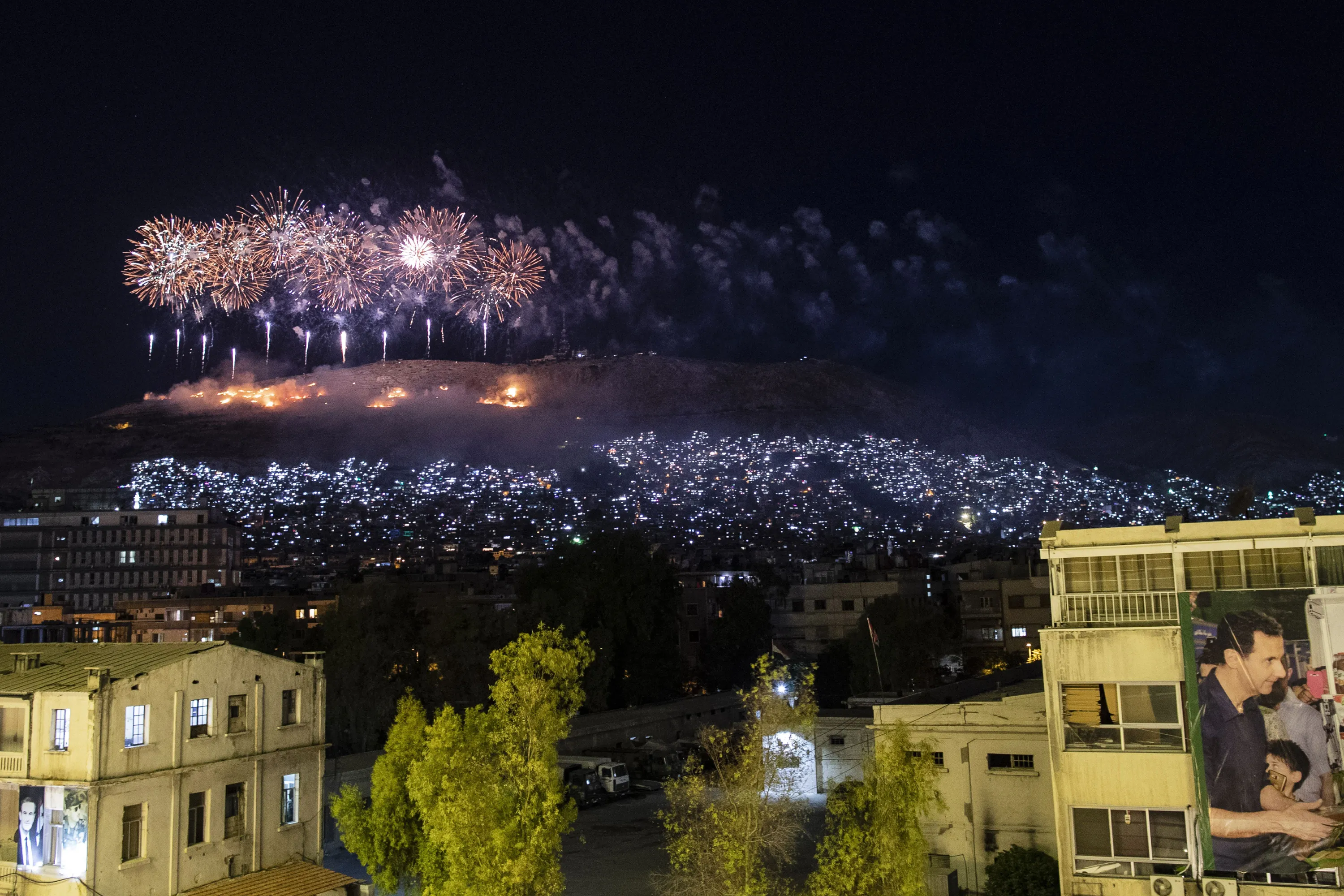 Fireworks explode over Qasioun Mountain as Syrian President Bashar Assad supporters celebrate Assad's presidential re-election, in Damascus, Syria, Thursday, May 27, 2021. Syrian President Bashar Assad was re-elected in a landslide, officials said Thursday, ushering in a fourth seven-year term. (Photo by Hassan Ammar/AP Photo)
