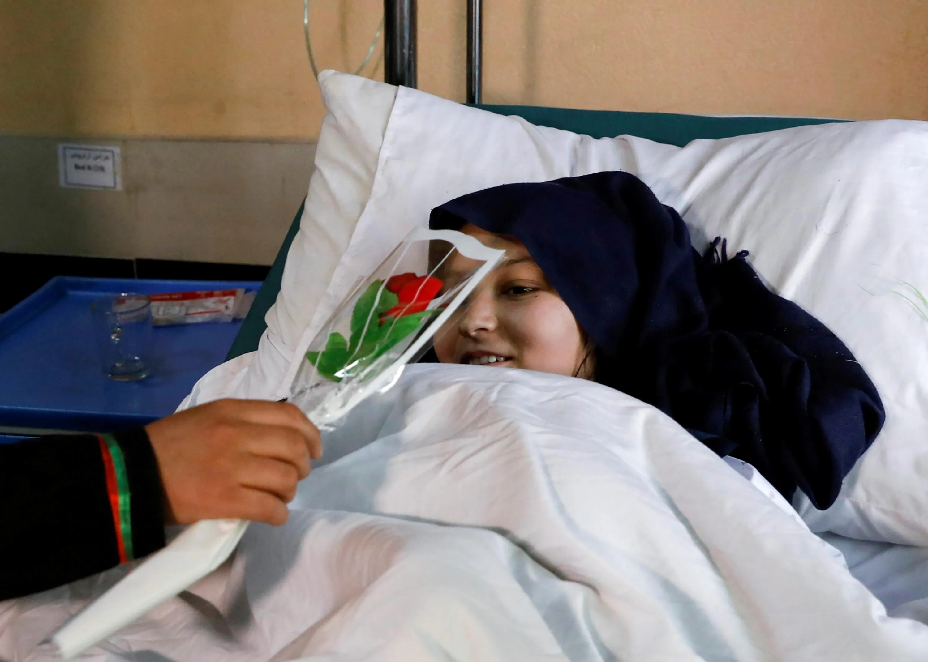A schoolgirl who was injured in the blast receives flowers from a student at a hospital in Kabul, Afghanistan on May 10, 2021. (Photo by Reuters/Stringer)