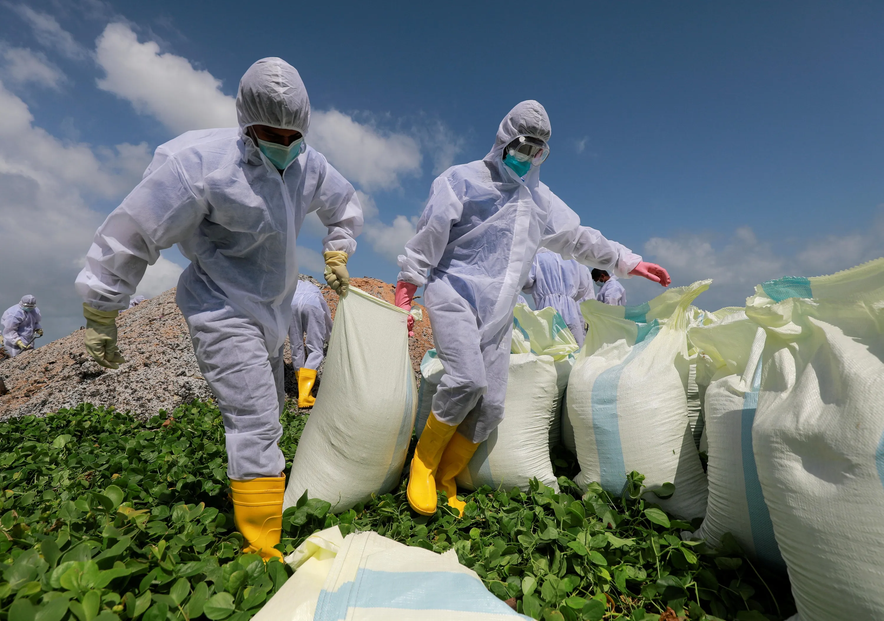 Sri Lankan navy members pull a sack with debris washed off to a beach from the MV X-Press Pearl container ship, which caught fire off the Colombo Harbour, on a beach in Ja-Ela, Sri Lanka May 28, 2021. The vessel, sailing with a Singaporean flag and carrying cosmetics and chemicals including 25 tonnes of nitric acid, was anchored off the Colombo harbour when a container caught fire. (Photo by Dinuka Liyanawatte/Reuters)