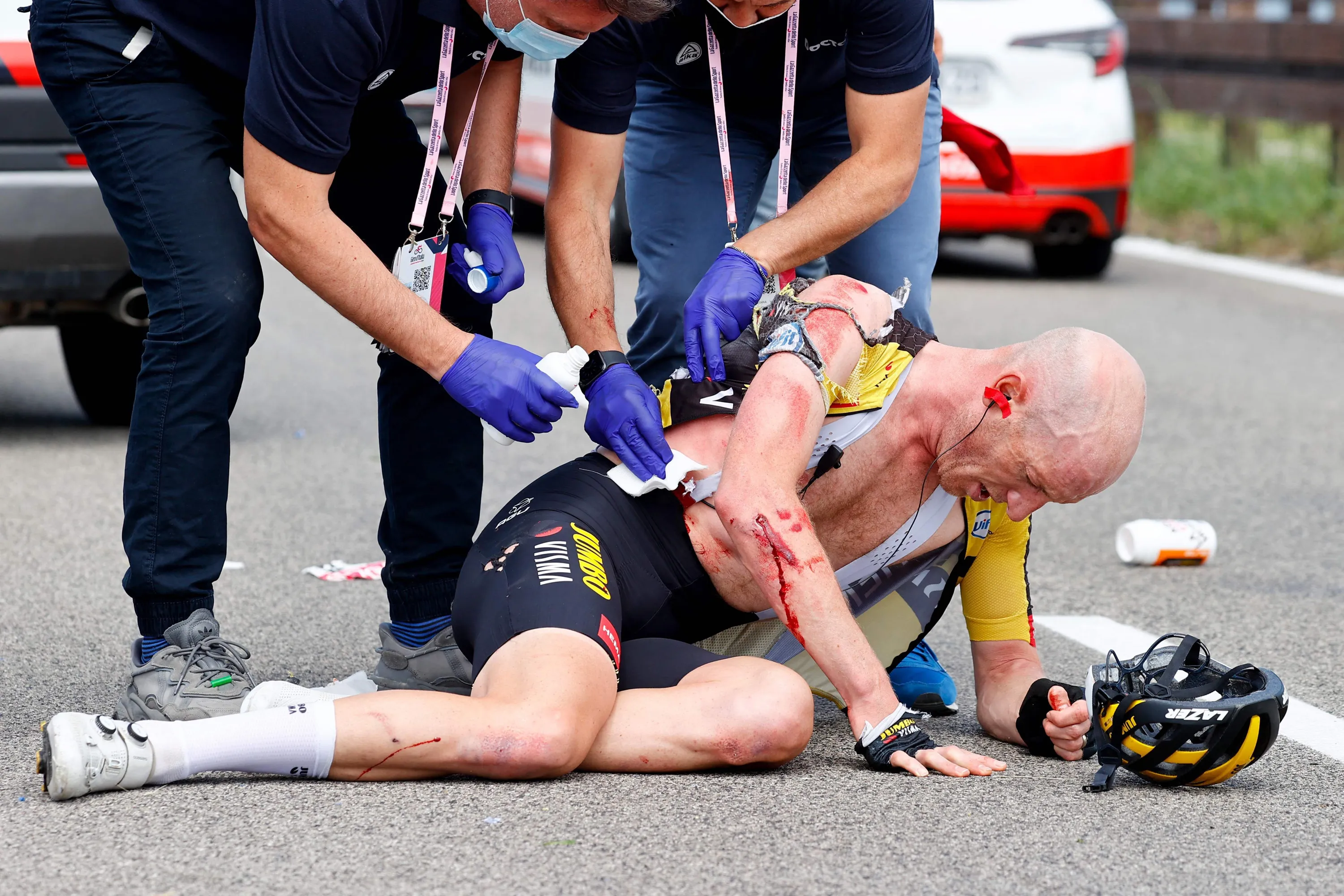 Dutch Jos van Emden of the Jumbo Visma cycling team is attended after a fall during the 15th stage of the Giro d'Italia 2021 cycling race, a 147km race between Grado and Gorizia on May 23, 2021. (Photo by Luca Bettini/AFP Photo)