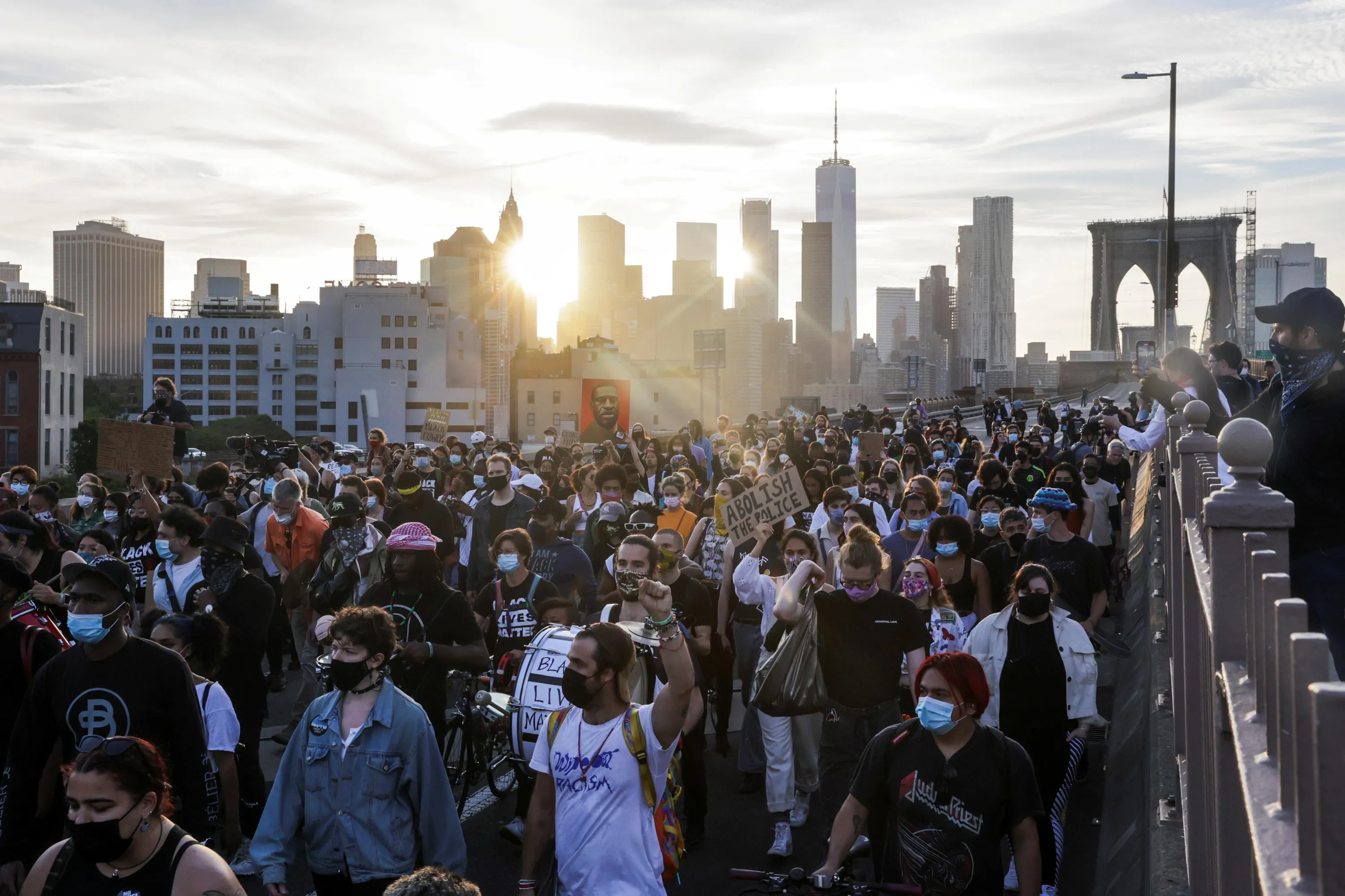 Protesters march on the Brooklyn Bridge during a demonstration on the first anniversary of the death of George Floyd, in New York City, New York, U.S., May 25, 2021. (Photo by Jeenah Moon/Reuters)