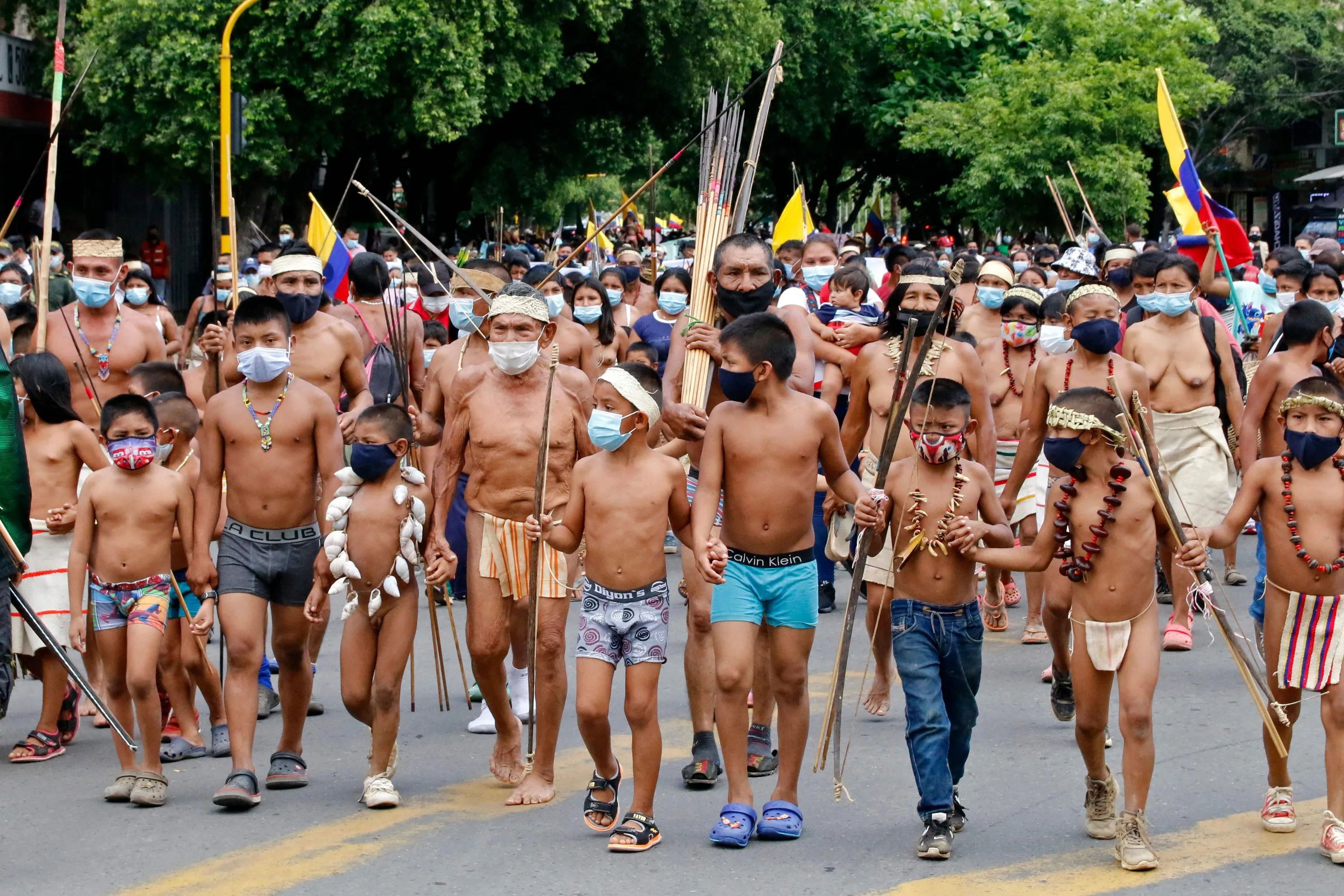 Members of the Bari ethnic group march during a protest against the government of President Ivan Duque for the breaching of territorial agreements, in Cucuta, Colombia, on the border with Venezuela, on May 31, 2021. (Photo by Schneyder Mendoza/AFP Photo)