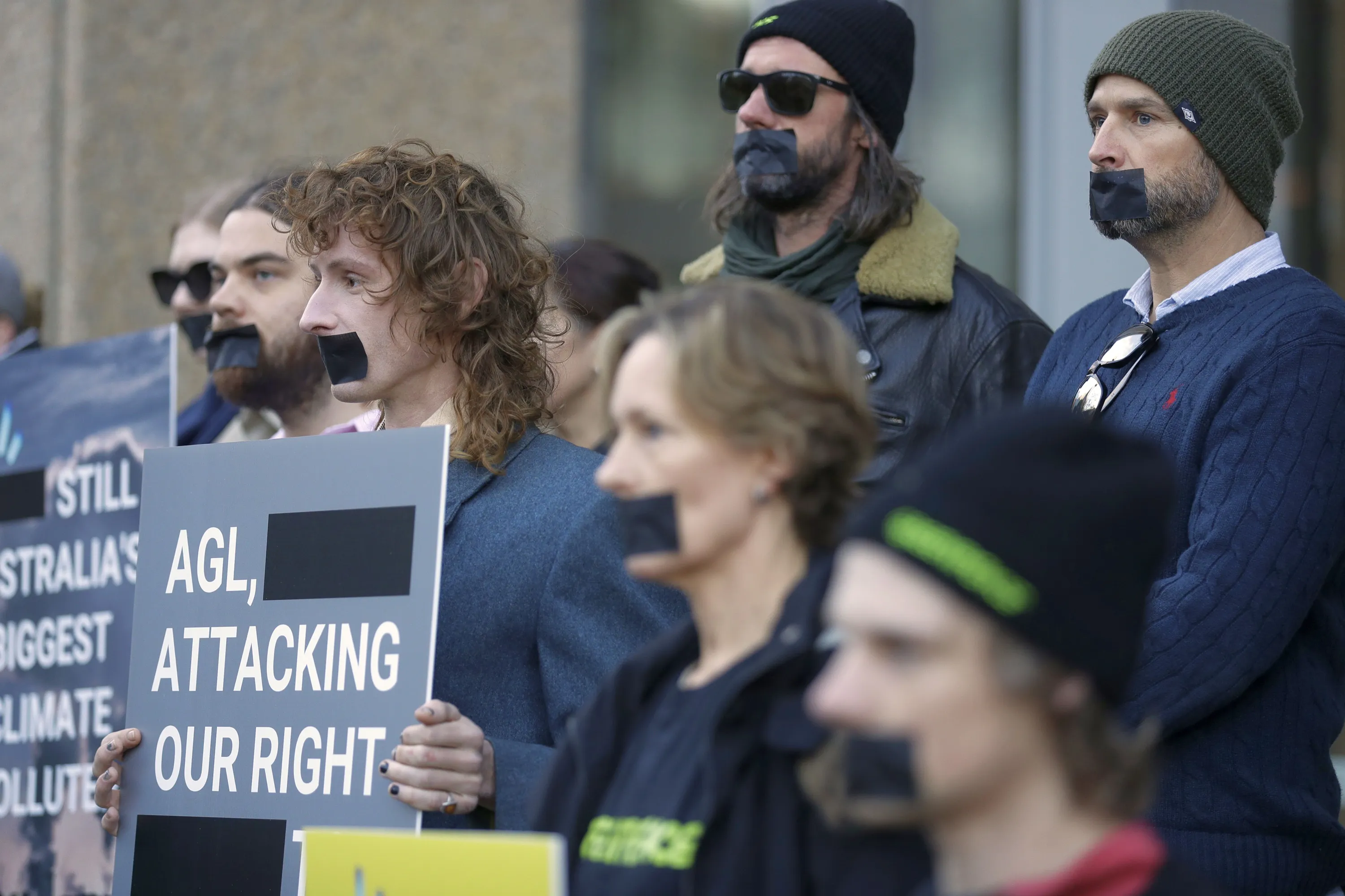 Greenpeace supporters demonstrate outside the Federal Court in Sydney, Wednesday, June 2, 2021. Australia's largest electricity generator AGL Energy is taking Greenpeace to court alleging breaches of copyright and trademark laws in the environmental charity's campaign that describes AGL as the nation's “biggest climate polluter”. (Photo by Rick Rycroft/AP Photo)