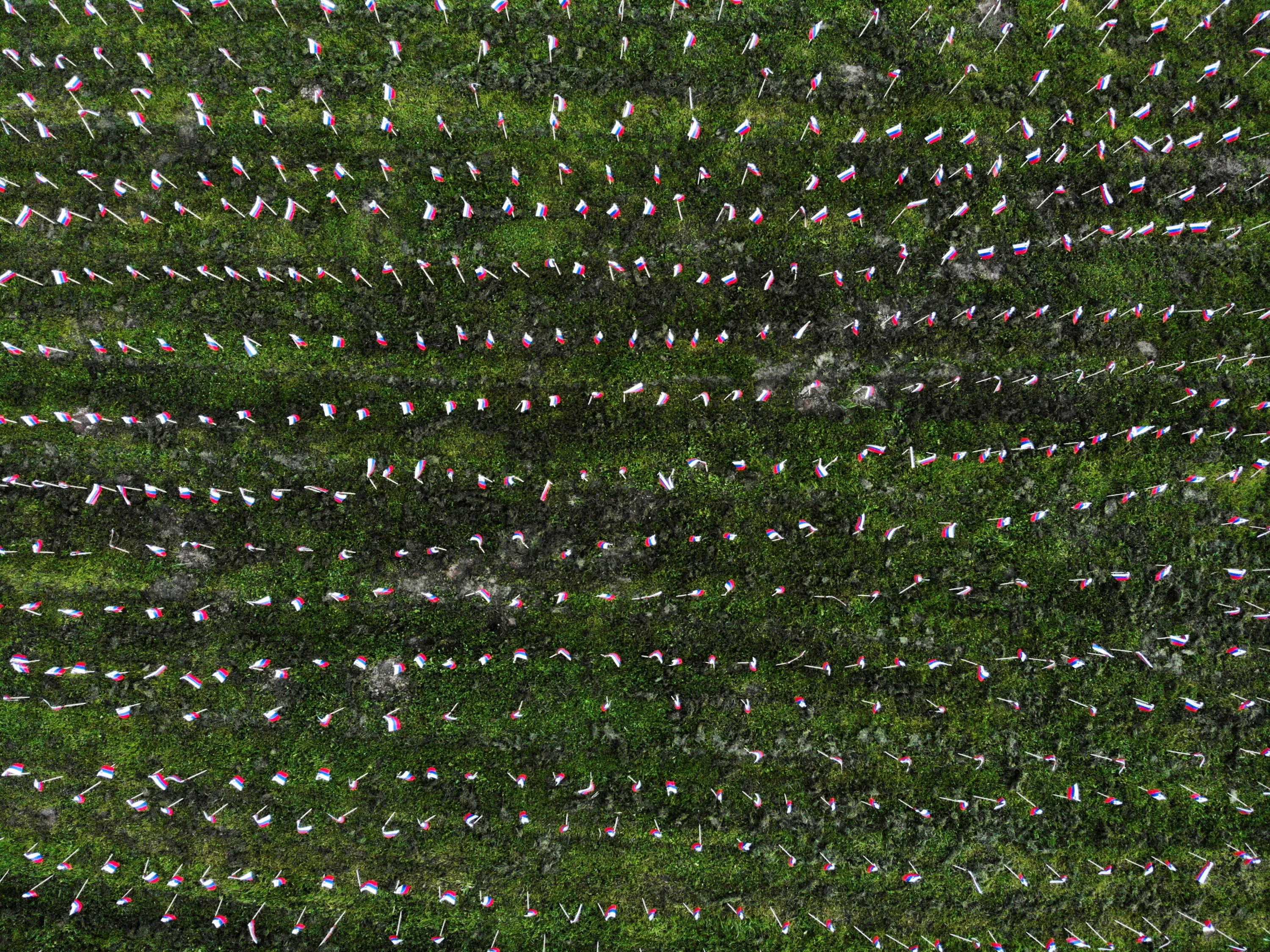 An aerial view shows flags planted by protesters in tribute to those who have died of the coronavirus disease (COVID-19), a year after the Slovenian government called an official end to its coronavirus epidemic, in Ljubljana, Slovenia on June 1, 2021. Picture taken using a drone. (Photo by Borut Zivulovic/Reuters)