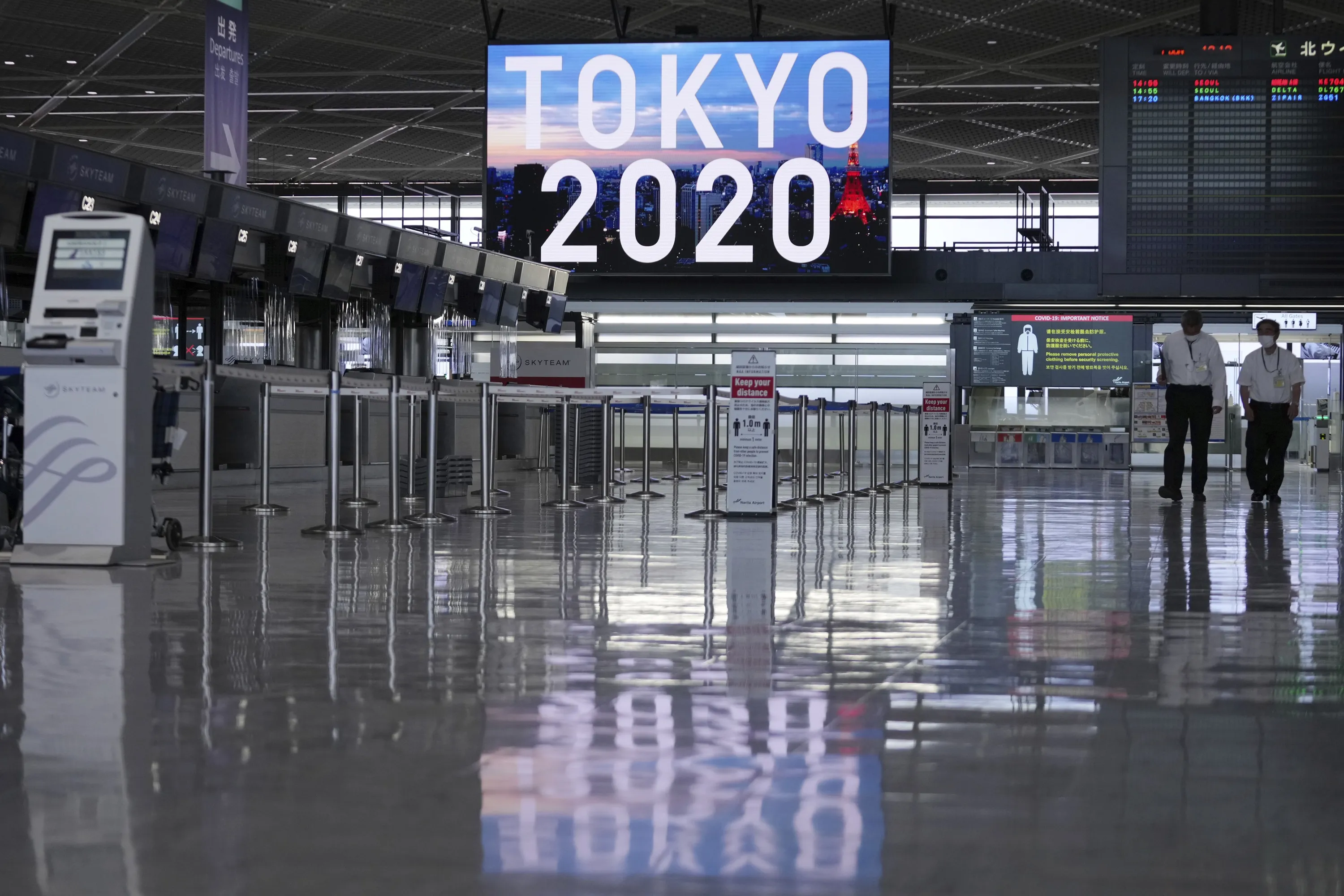 Staff wearing protective masks to help curb the spread of the coronavirus walk in the empty ticketing area at Narita International Airport Tuesday afternoon, June 1, 2021, in Narita, east of Tokyo. A state of emergency in Tokyo, Osaka and other prefectures was last week extended until June 20 as COVID-19 cases continue to put the medical system under strain. (Photo by Eugene Hoshiko/AP Photo)