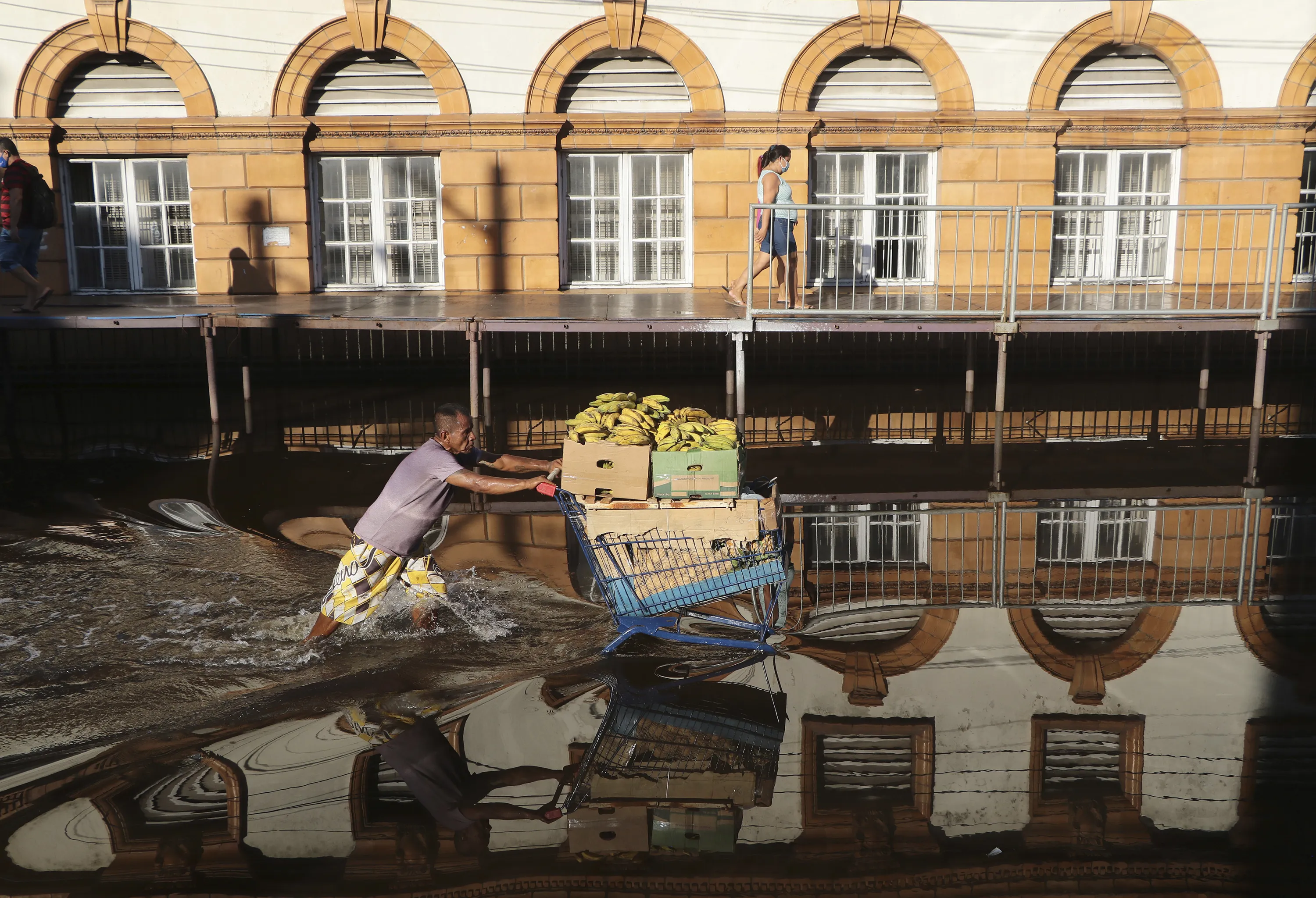 A man pushes a shopping cart loaded with bananas on a street flooded by the Negro River, in downtown Manaus, Amazonas state, Brazil, Tuesday, June 1, 2021. Rivers around Brazil's biggest city in the Amazon rain forest have swelled to levels unseen in over a century of record-keeping, according to data published Tuesday by Manaus' port authorities. (Photo by Edmar Barros/AP Photo)
