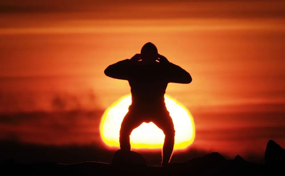A man does physical exercise during sunset over the Finnish Gulf coast in St. Petersburg, Russia, Wednesday, April 14, 2021. (Photo by Dmitri Lovetsky/AP Photo)