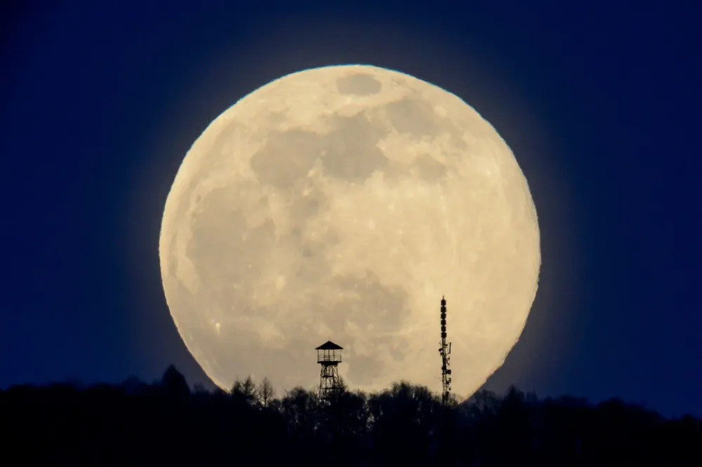 The full moon rises above the Karancs Hills pictured from Karancskeszi, Hungary, 28 March 2021. (Photo by Peter Komka/EPA/EFE)