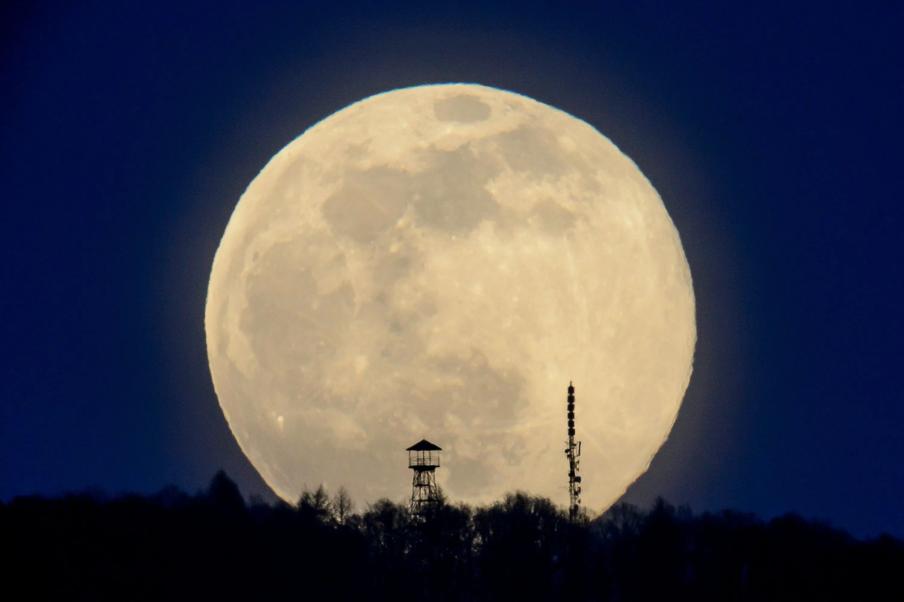 The full moon rises above the Karancs Hills pictured from Karancskeszi, Hungary, 28 March 2021. (Photo by Peter Komka/EPA/EFE)