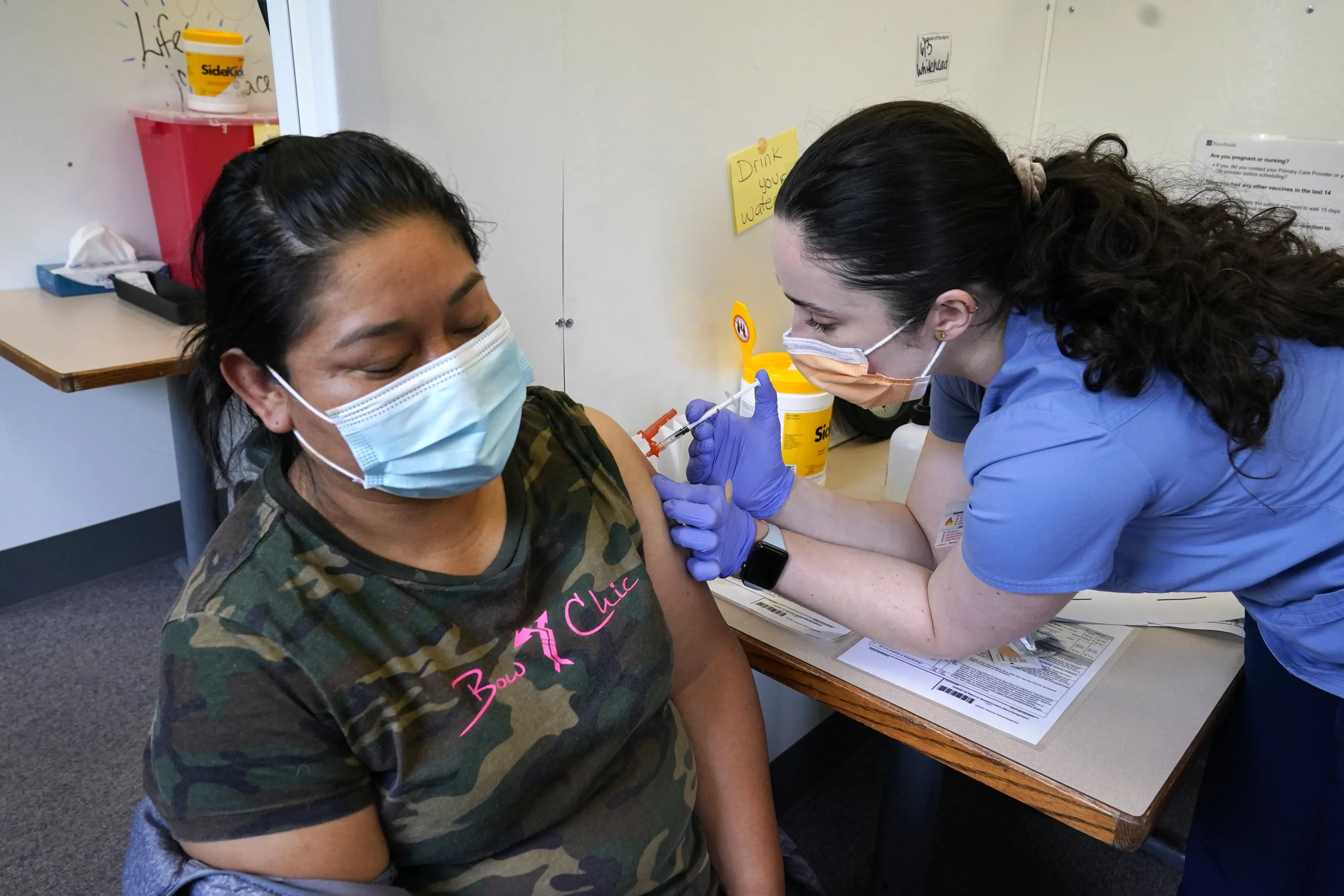 Medical assistant Andreea Marian, right, gives a COVID-19 vaccine to Gabina Morales at a clinic at PeaceHealth St. Joseph Medical Center Thursday, June 3, 2021, in Bellingham, Wash. Washington is the latest state to offer prizes to encourage people to get vaccinated against COVID-19, with Gov. Jay Inslee on Thursday announcing a series of giveaways during the month of June that includes lottery drawings totaling $2 million, college tuition assistance, airline tickets and game systems. (Photo by Elaine Thompson/AP Photo)