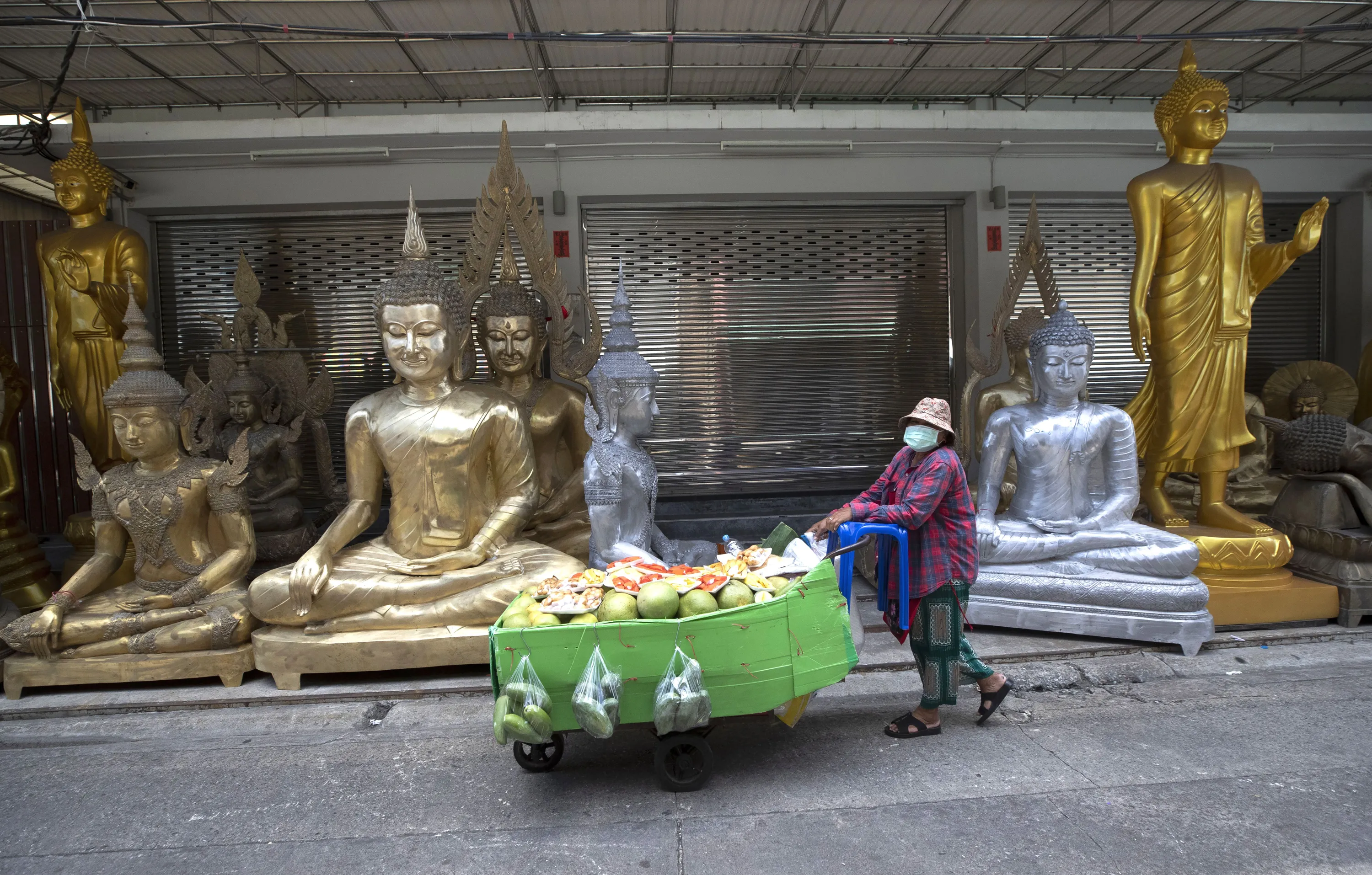 A fruit vendor wearing a protective mask to help curb the spread of the coronavirus pushes her cart past giant Buddhist statues for sale in Bangkok, Thailand, Thursday, May 27, 2021. (Photo by Sakchai Lalit/AP Photo)