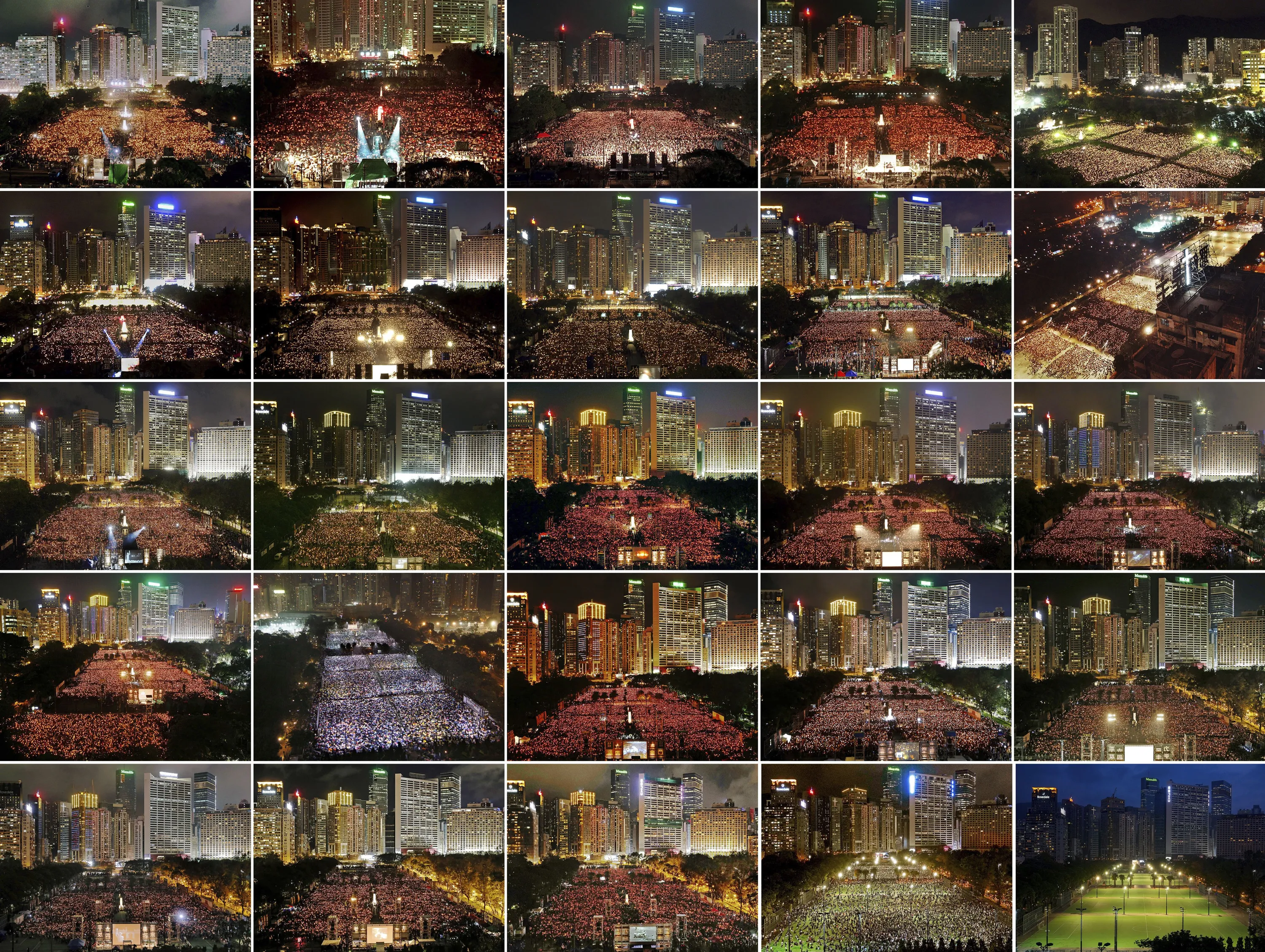 This combination of images between 1997 and 2021 shows thousands of people attend a June 4th candlelight vigil in Hong Kong's Victoria Park to mark the anniversary of the military crackdown on a pro-democracy student movement in Beijing, except for this year at bottom right. Hong Kong is the only region under Beijing's jurisdiction that holds significant public commemorations of the 1989 crackdown and memorials for its victims. Hong Kong has a degree of freedom not seen on the mainland as a legacy of British rule that ended in 1997. Top row from left are 1997, 1998, 1999, 2000, and 2001. Second row from left are 2002, 2003, 2004, 2005 and 2006. Third row from left are 2007, 2008, 2009, 2010 and 2011. Fourth row from left are 2012, 2013, 2014, 2015 and 2016. Bottom row from left are 2017, 2018, 2019, 2020 and 2021. (Photo by AP Photo)