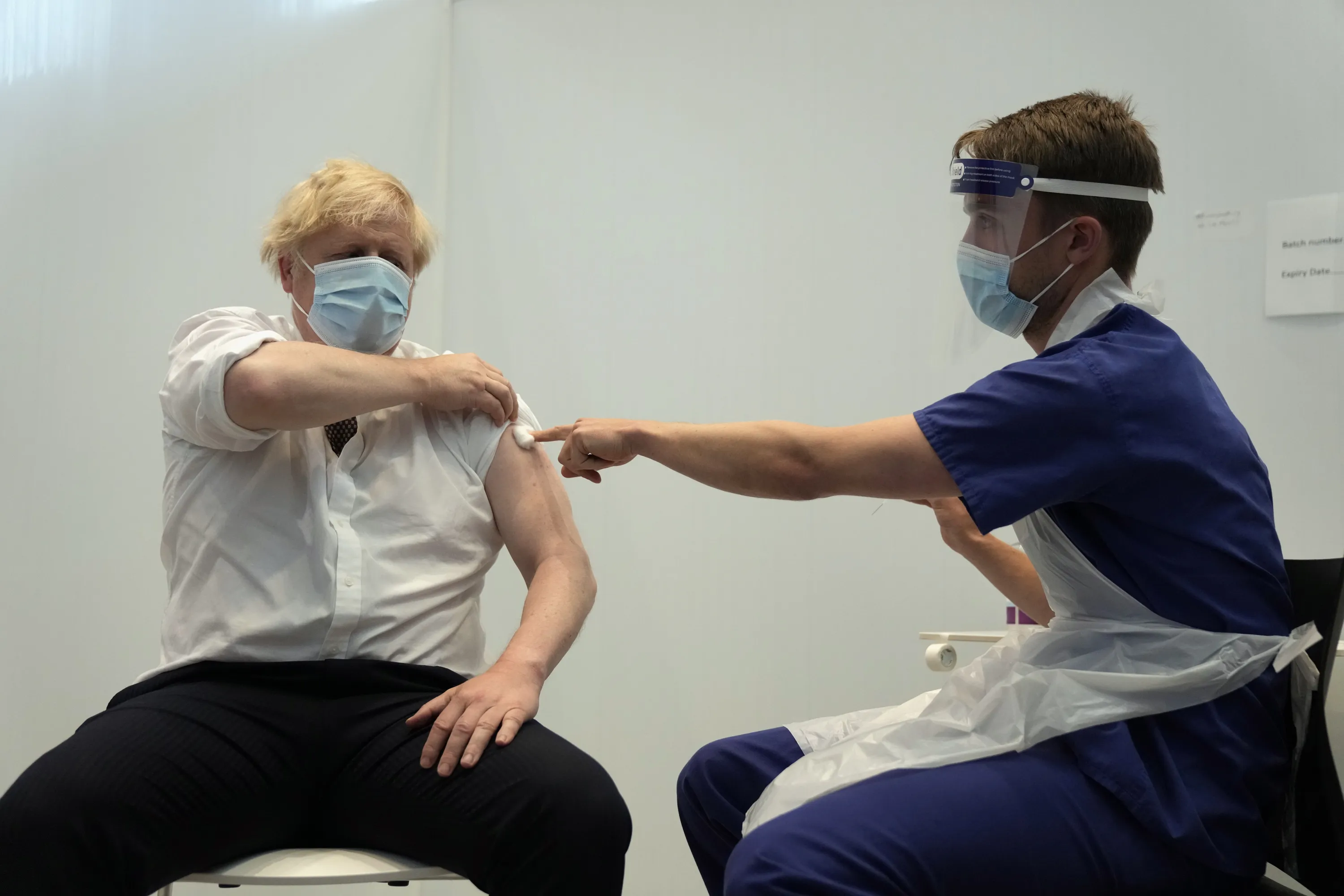 British Prime Minister Boris Johnson after receiving his second jab of the AstraZeneca coronavirus vaccine, at the Francis Crick Institute in London, Thursday, June 3, 2021. (Photo by Matt Dunham/AP Photo/Pool)