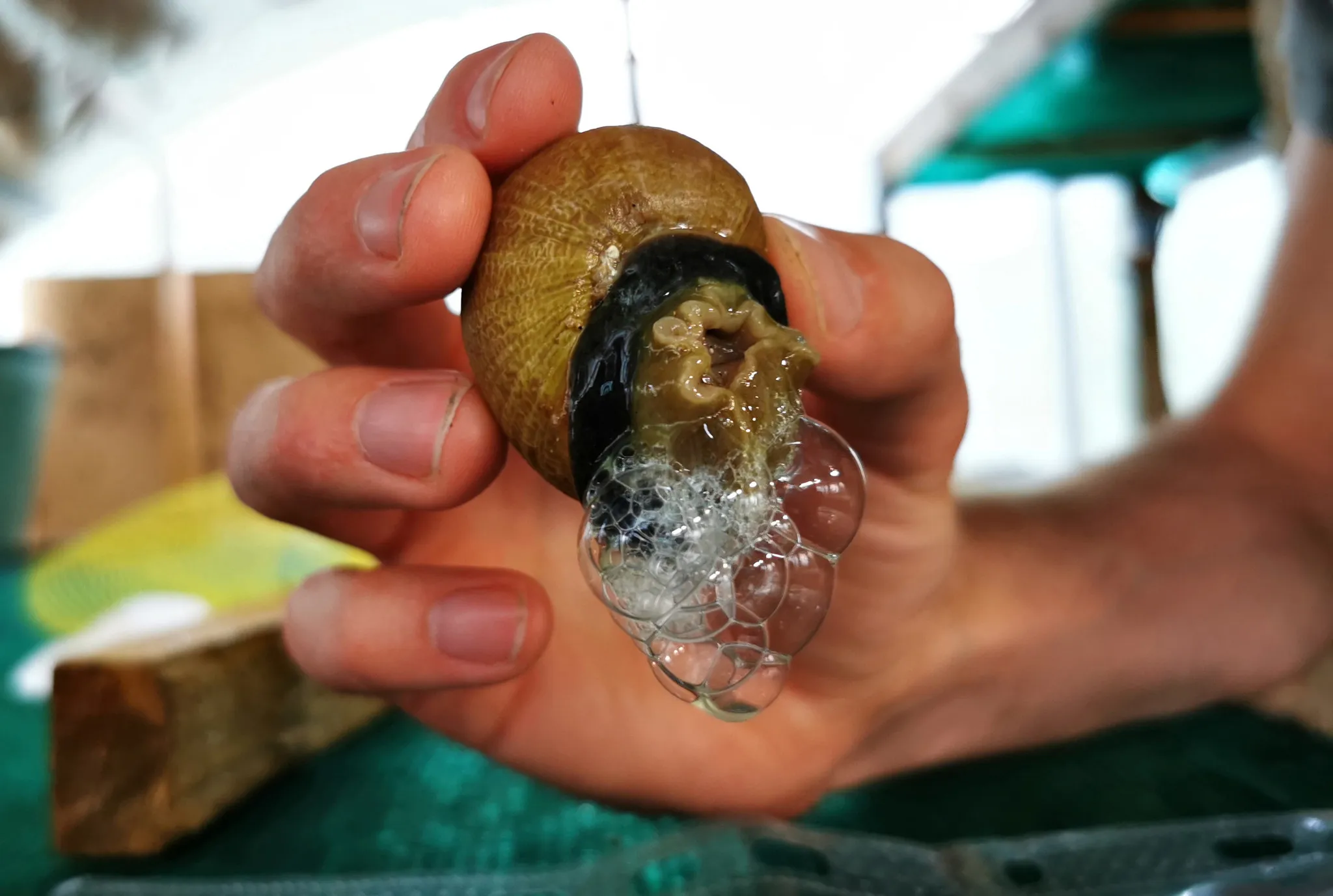 French snail grower and soap maker Damien Desrocher holds a snail as he extracts slime that he used to make soap bars in his snail enclosure in Wahagnies, near Lille, France, May 11, 2021. (Photo by Ardee Napolitano/Reuters)