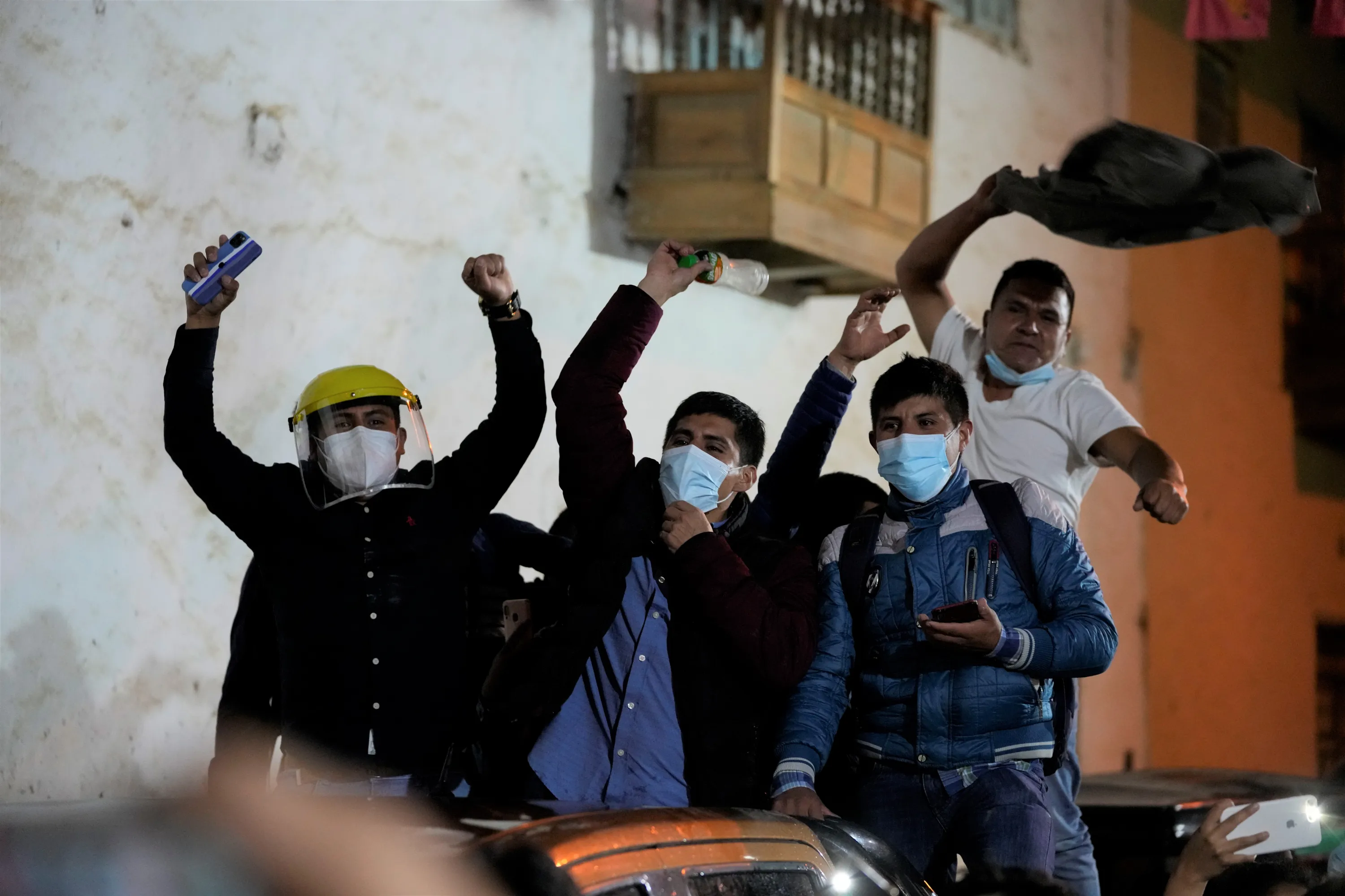 Supporters of presidential candidate Pedro Castillo cheer in the street during a runoff election, in Tacabamba, Peru, Sunday, June 6, 2021. Peruvians voted in a presidential run-off election to choose between Fujimori, the daughter of jailed ex-President Alberto Fujimori, and Pedro Castillo, a political novice that until recent was a rural schoolteacher. (Photo by Martin Mejia/AP Photo)