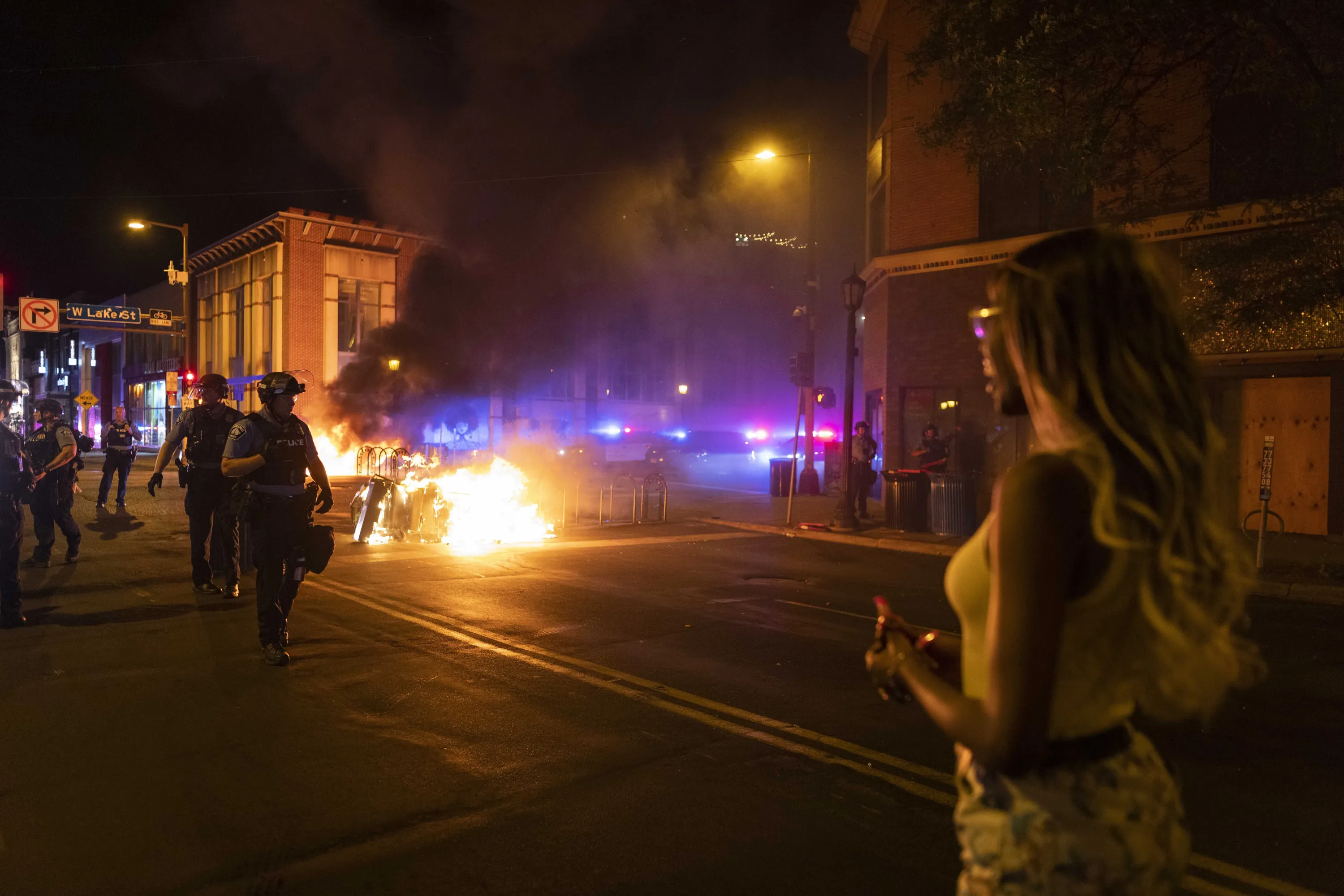 Police stand guard after protesters set fire to dumpsters on the street after a vigil was held for Winston Boogie Smith Jr. early on Saturday, June 5, 2021. Smith was shot and killed by law enforcement officers on Thursday during an arrest warrant operation. (Photo by Christian Monterrosa/AP Photo)