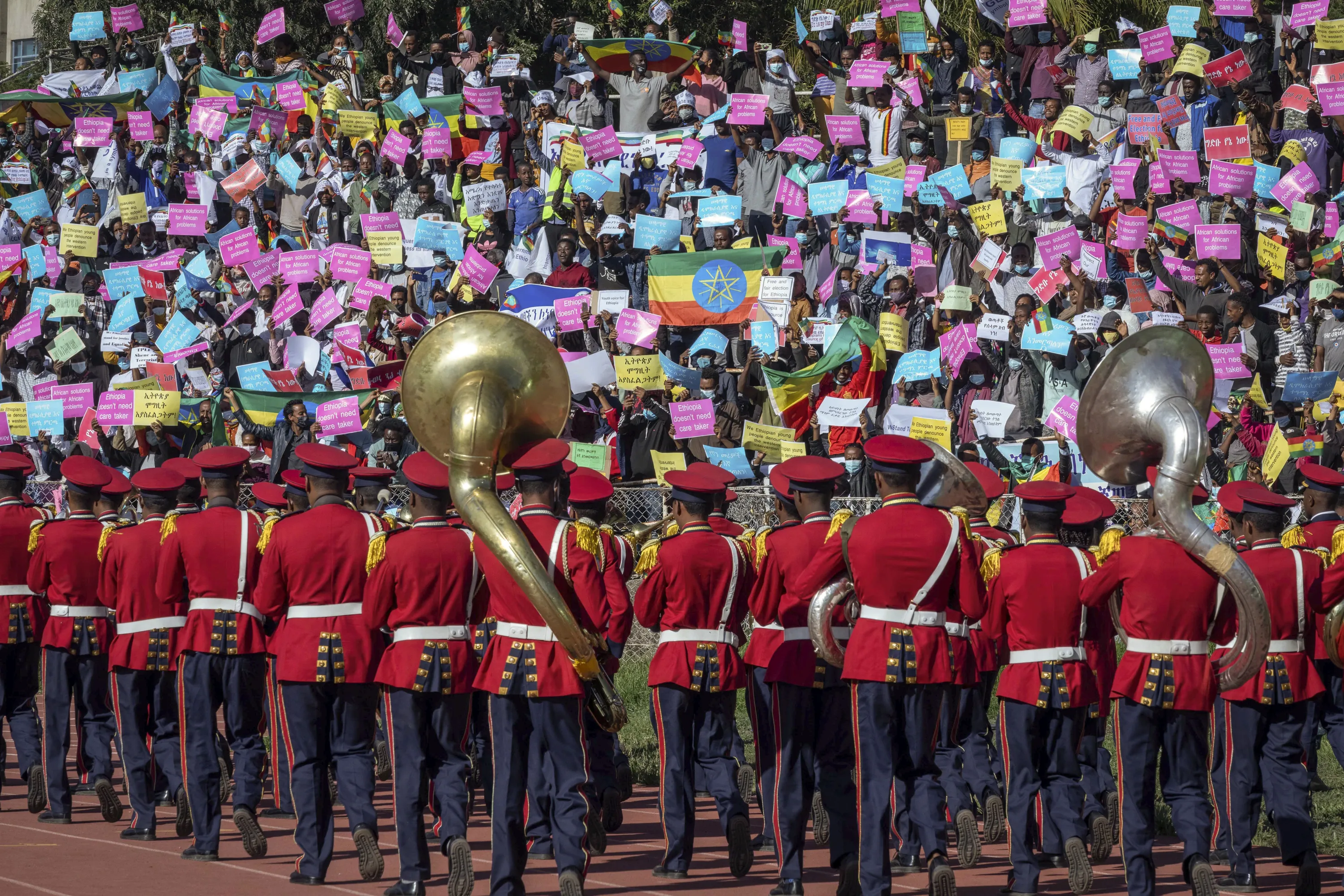 Ethiopians protest against international pressure on the government over the conflict in Tigray, at a demonstration organised by the city mayor's office held at a stadium in the capital Addis Ababa, Ethiopia Sunday, May 30, 2021. Thousands of Ethiopians gathered Sunday to protest outside pressure on the government over its brutal war in Tigray, after the U.S. said last week it has started restricting visas for government and military officials of Ethiopia and Eritrea who are seen as undermining efforts to resolve the fighting. (Photo by Mulugeta Ayene/AP Photo)