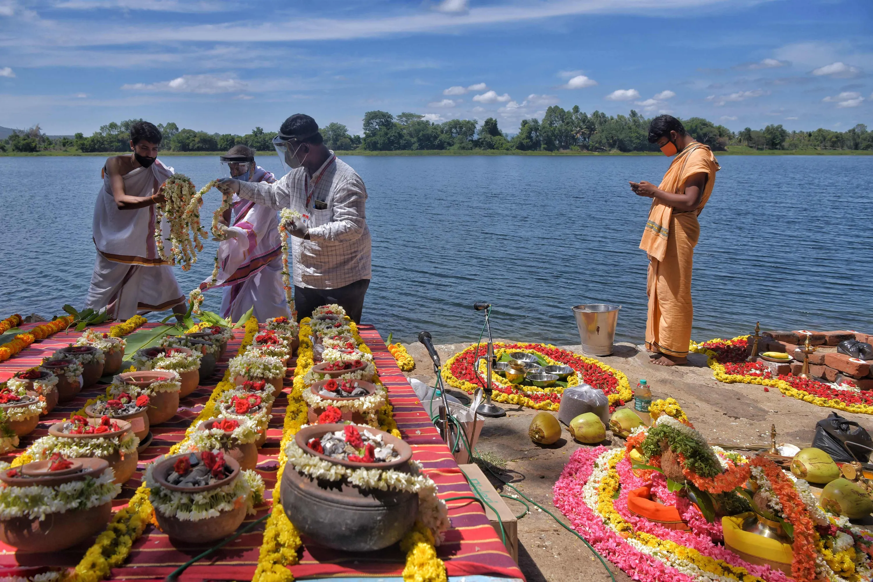 Hindu decorate with flowers over 560 unclaimed clay urns containing ashes of people who died due to Covid-19 coronavirus on the banks of river Cauvery before a mass immersion ritual organised by the government of Karnataka, in Belakavadi Village in Mandya District situated about 125 Km from Bangalore on June 2, 2021. (Photo by Manjunath Kiran/AFP Photo)