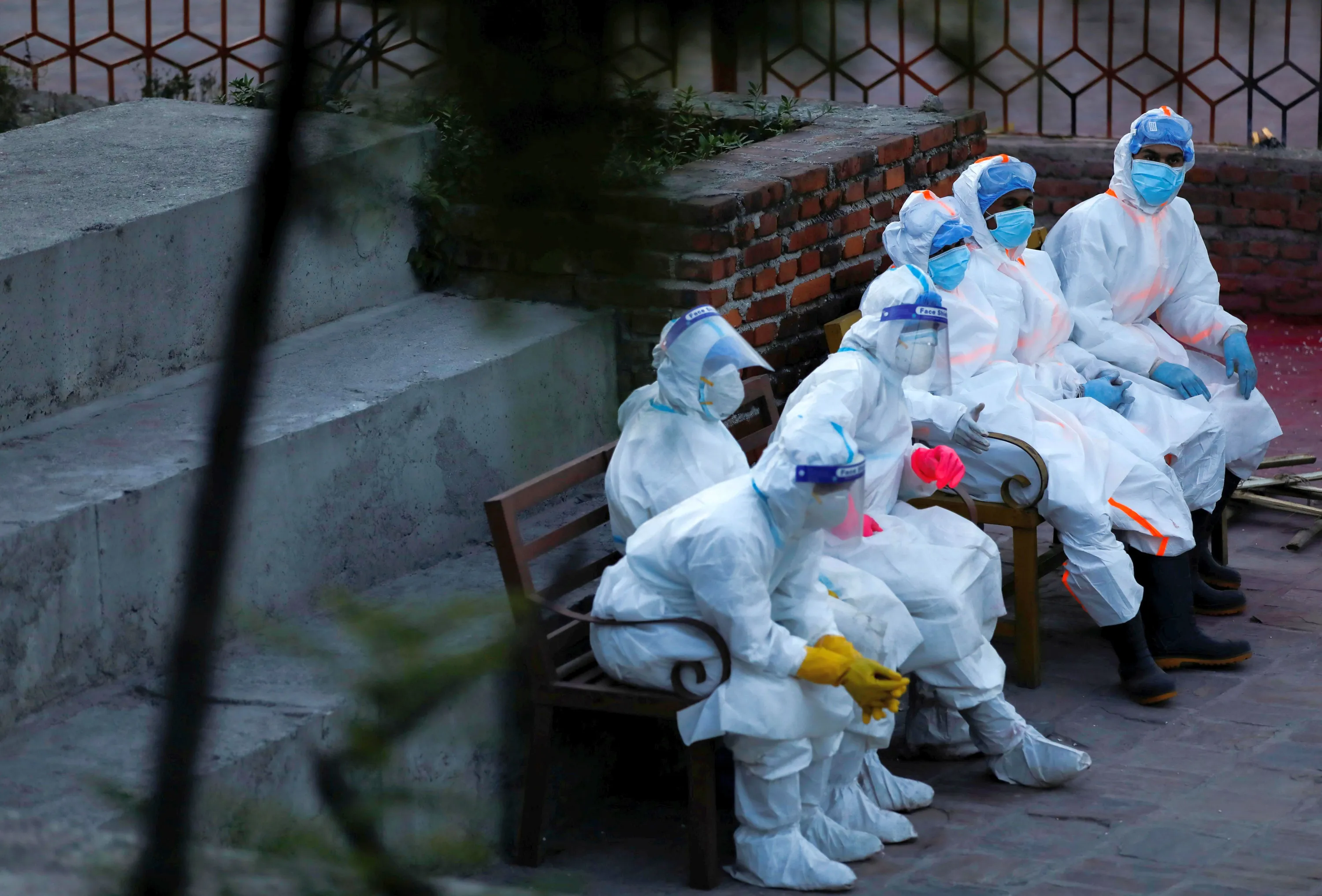Members of the Nepal Army take rest after cremating the bodies of people who died from the coronavirus disease (COVID-19) as the country recorded the highest daily increase in deaths since the pandemic began, at the crematorium, in Kathmandu, Nepal on May 9, 2021. (Photo by Navesh Chitrakar/Reuters)