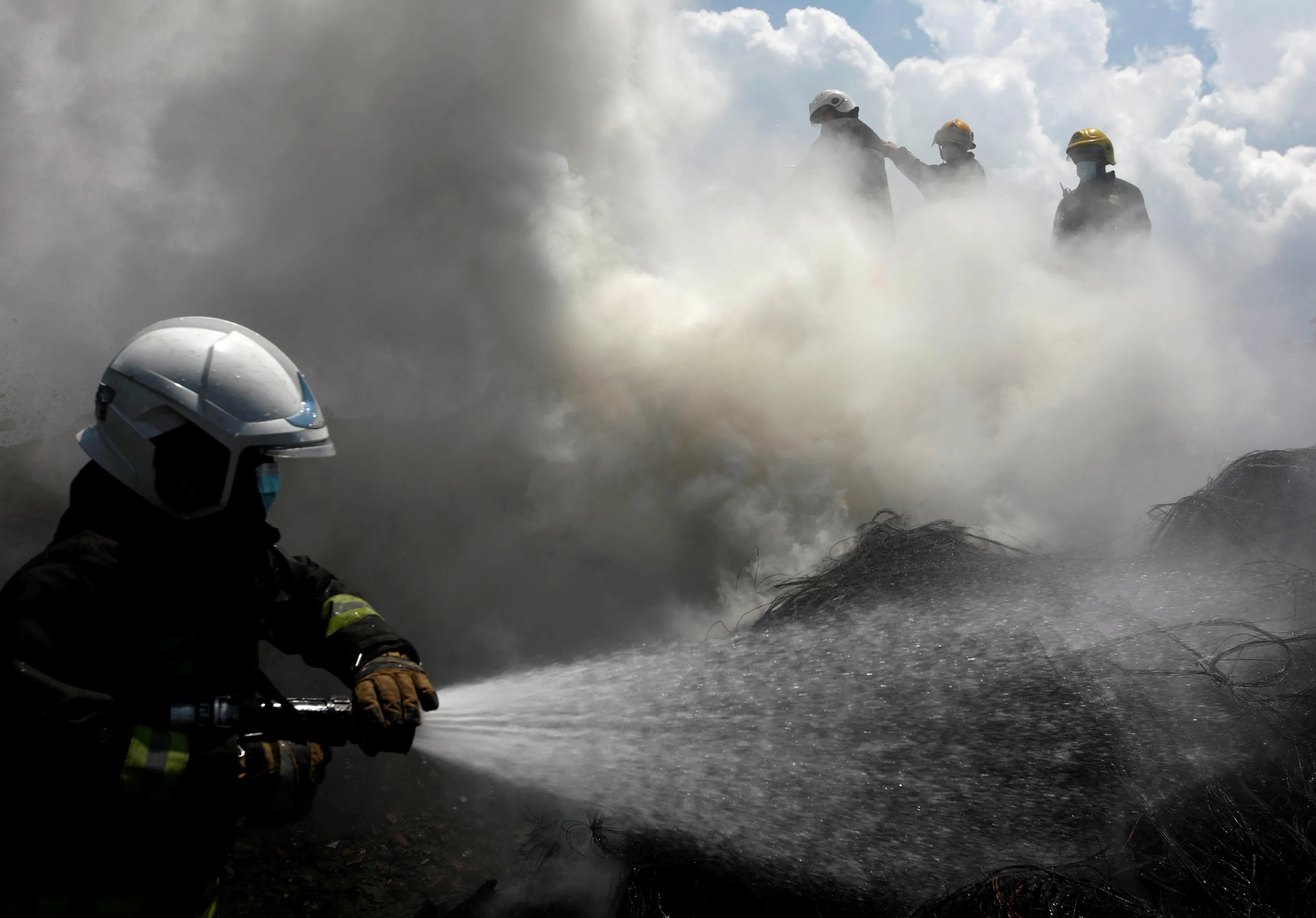 Smoke rises as firefighters try to douse a fire on a pile of wires at the premises of Environment Health and Health Care Waste Management Section in Kathmandu, Nepal on June 3, 2021. (Photo by Navesh Chitrakar/Reuters)