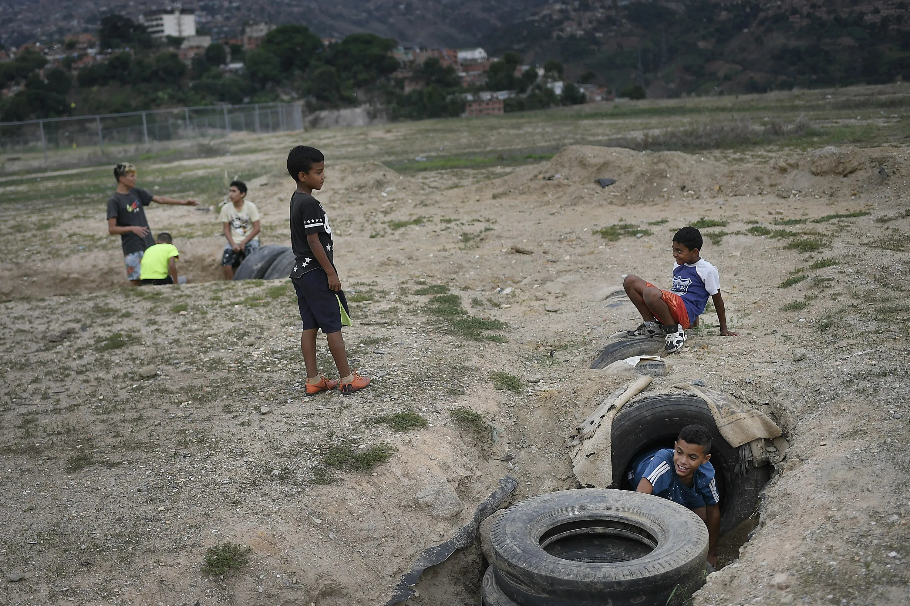 Children play in an abandoned military exercise field in the Ojo de Agua neighborhood of Caracas, Venezuela, Sunday, May 23, 2021. (Photo by Matias Delacroix/AP Photo)