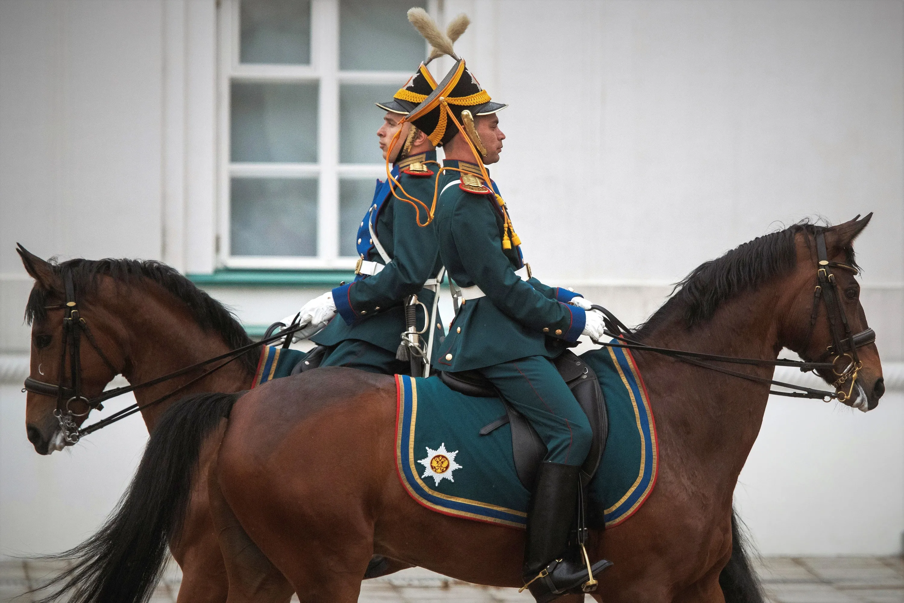 Kremlin guards perform at the Cathedral Square during a ceremony of the Changing of the Guard in the Kremlin, in Moscow, Russia, Saturday, May 29, 2021. (Photo by Pavel Golovkin/AP Photo)