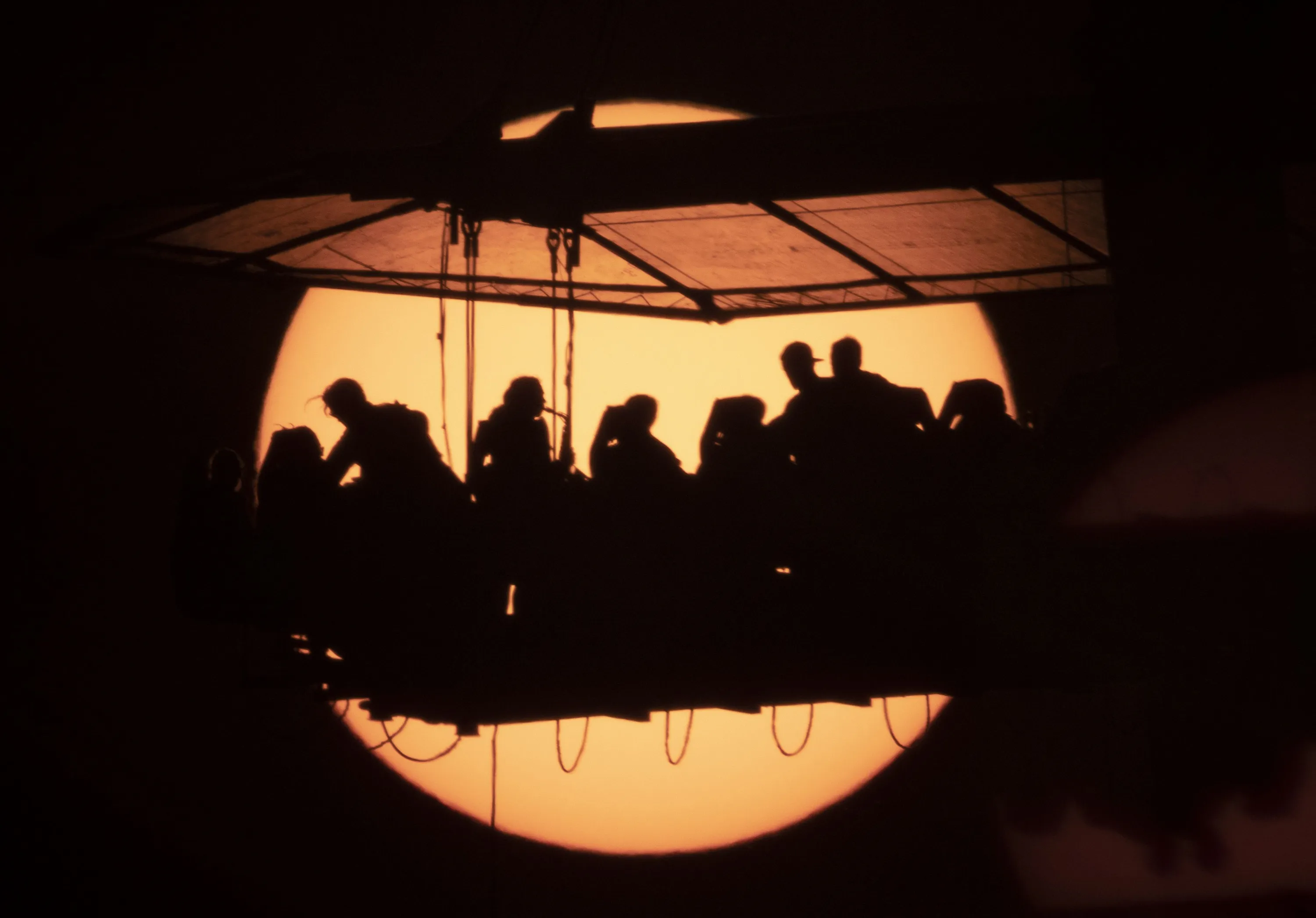 People have dinner sitting on a platform raised by a crane to a height of 50 meters and silhouetting against the sun as they participate the traveling international project “Dinner in the Sky” in St. Petersburg, Russia, Wednesday, June 2, 2021. (Photo by Dmitri Lovetsky/AP Photo)