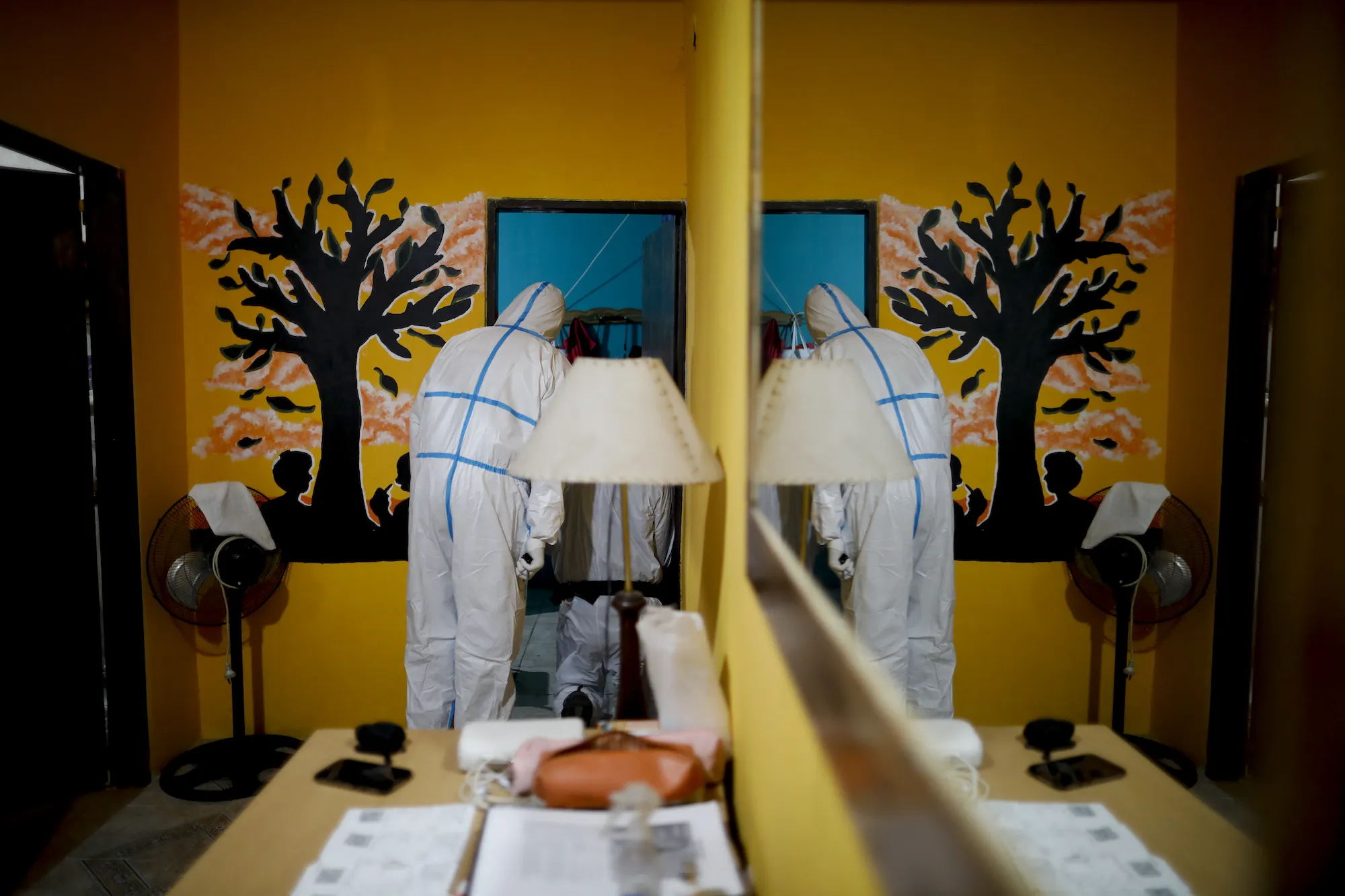Ambulance worker Claudio Donato tries to convince a COVID-19 patient to leave home for the hospital as he experiences breathing problems and lack of oxygen, during Donato's night shift in Lomas de Zamora, Argentina, late Thursday, June 10, 2021. (Photo by Natacha Pisarenko/AP Photo)
