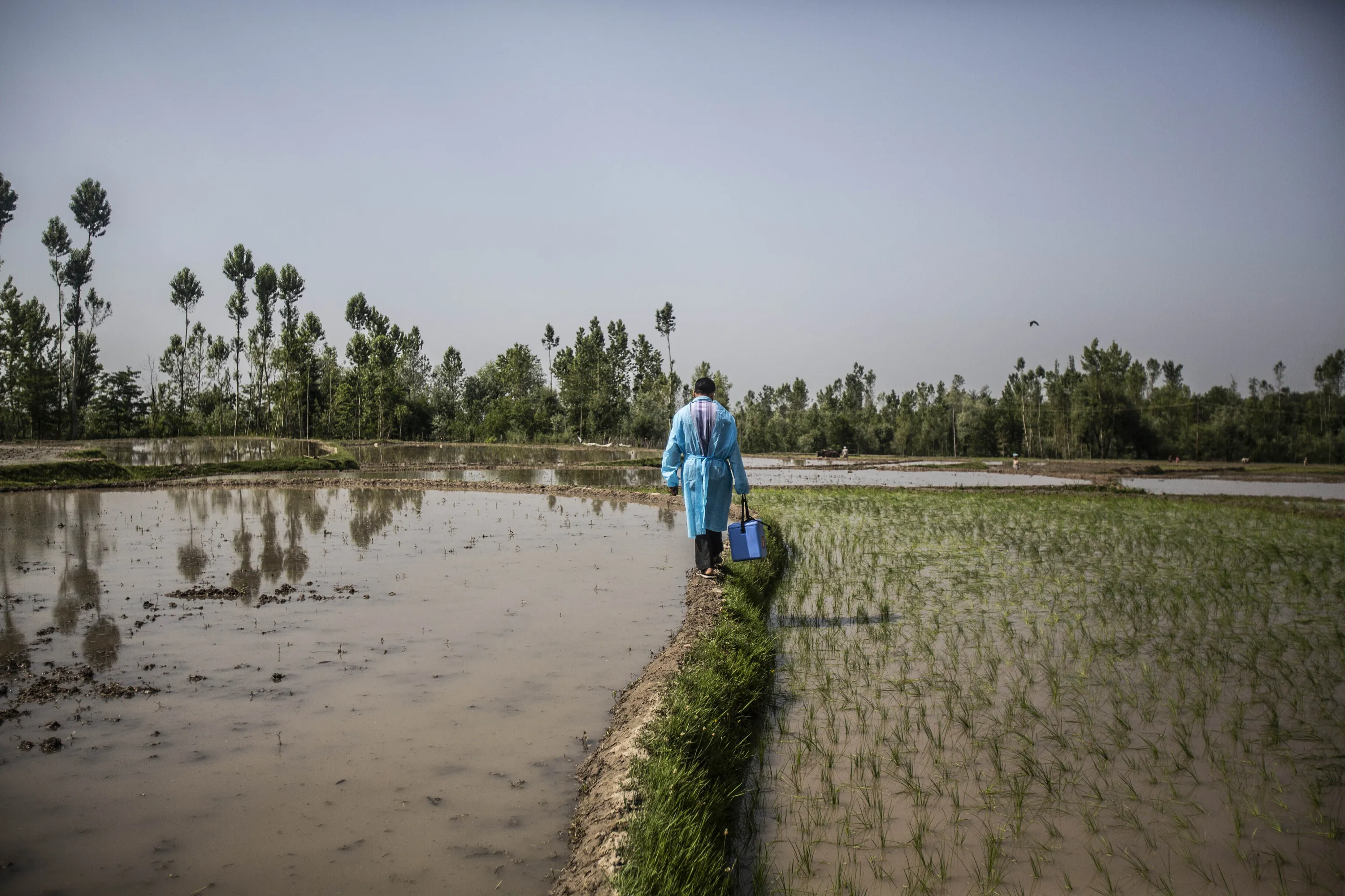 A health worker crosses a paddy field during a vaccination drive against COVID-19 in Minnar village, north of Srinagar, Indian controlled Kashmir, Thursday, June 10, 2021. (Photo by Mukhtar Khan/AP Photo)