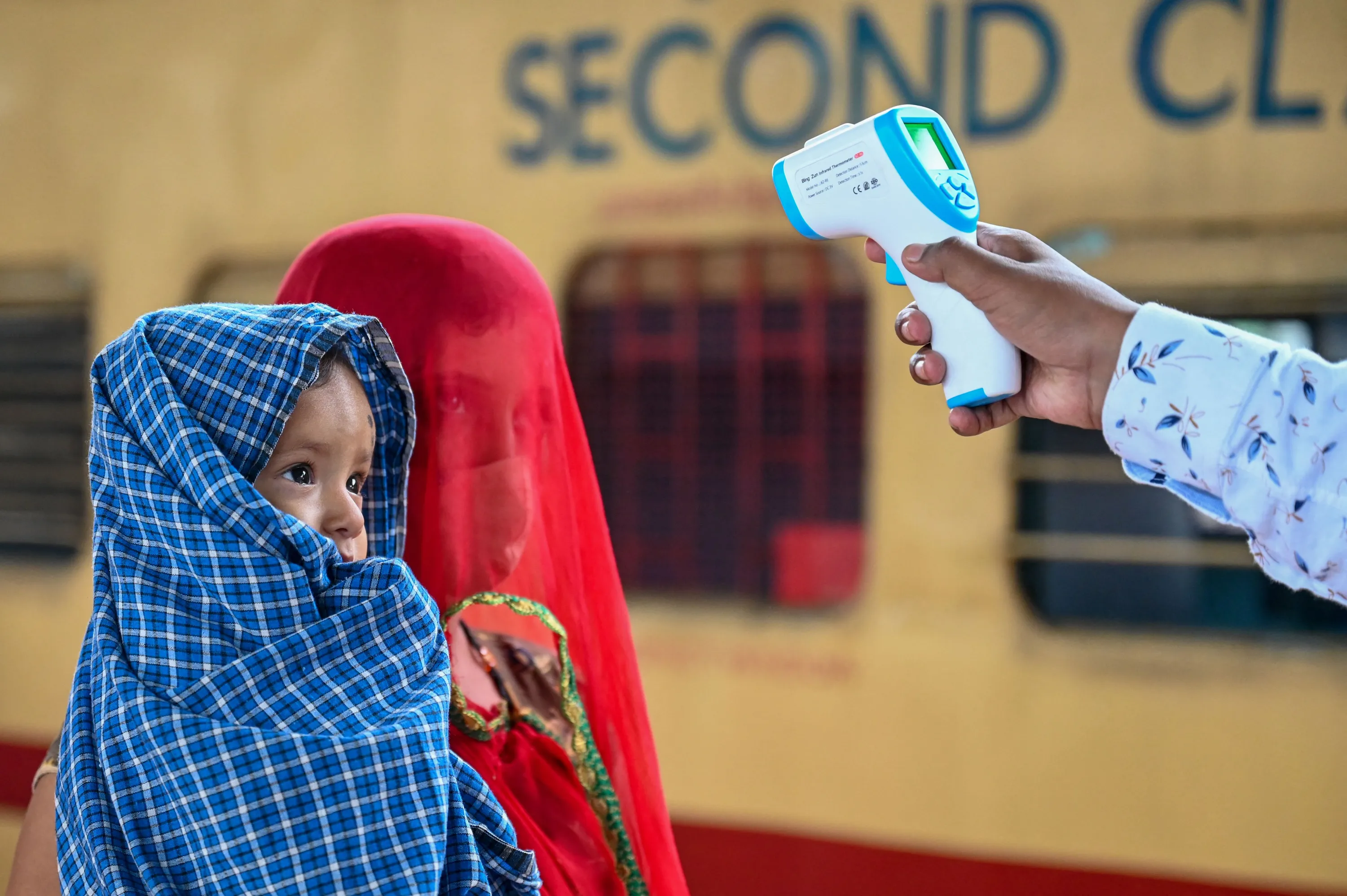 A health worker checks the body temperature of a passenger during a Covid-19 coronavirus screening as she arrives with her child at a railway platform on a long distance train, in Mumbai on June 8, 2021. (Photo by Punit Paranjpe/AFP Photo)