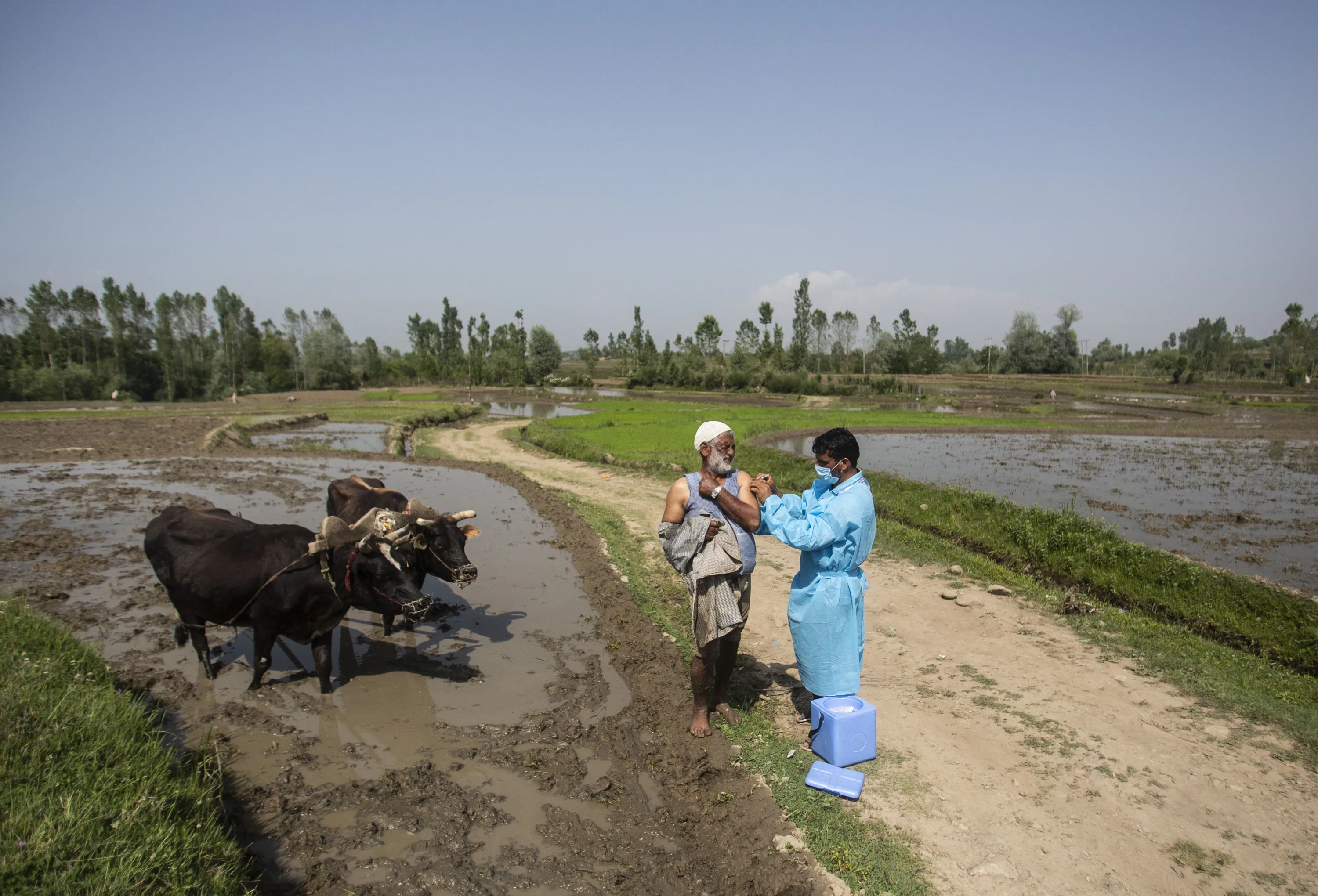 A health worker administers the AstraZeneca vaccine for COVID-19 to a Kashmiri farmer at Minnar village, north of Srinagar, Indian controlled Kashmir, Thursday, June 10, 2021. (Photo by Mukhtar Khan/AP Photo)