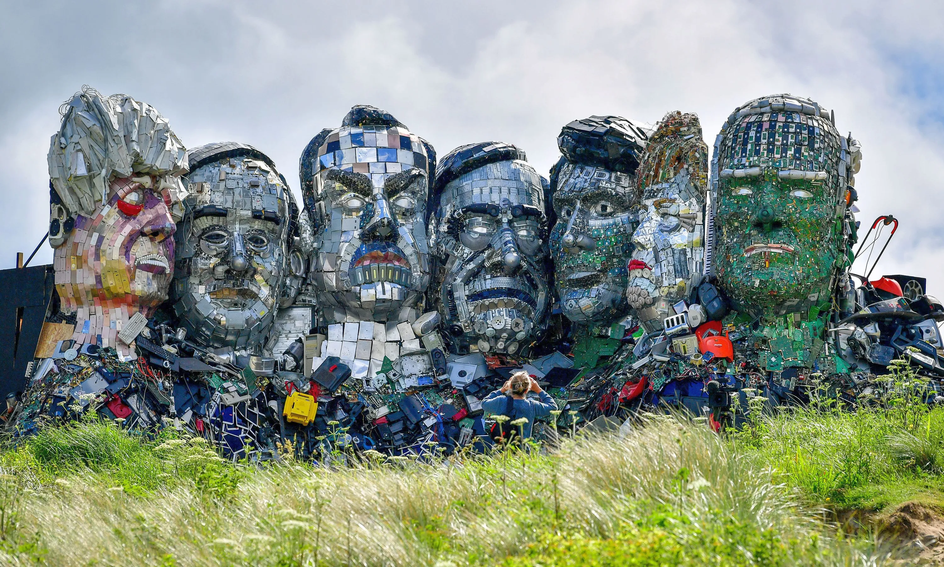 A woman photographs an artwork “Mount Recyclemore”, an artwork depicting the G7 leaders looking towards Carbis Bay, made from electronic waste by artists Joe Rush and Alex Wreckage, ahead of the G7 summit, at Hayle Towans in Cornwall, Britain, June 8, 2021. (Photo by Ben Birchall/PA Images via Getty Images)