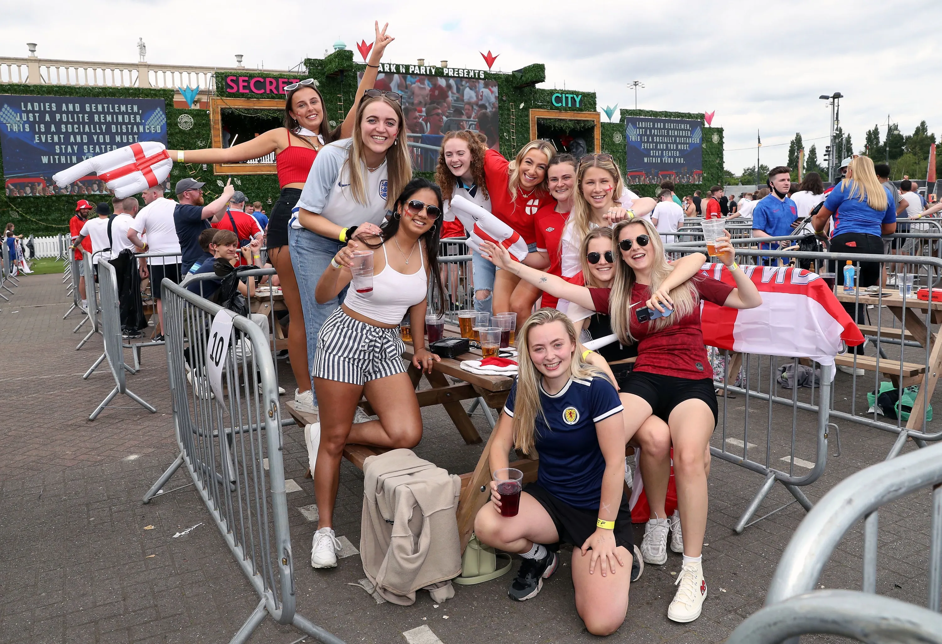England fans and a Scotland fan at the fan zone in Trafford Park, Manchester on Sunday, June 13, 2021 as they watch the UEFA Euro 2020 Group D match between England and Croatia held at Wembley Stadium. (Photo by Bradley Collyer/PA Images via Getty Images)