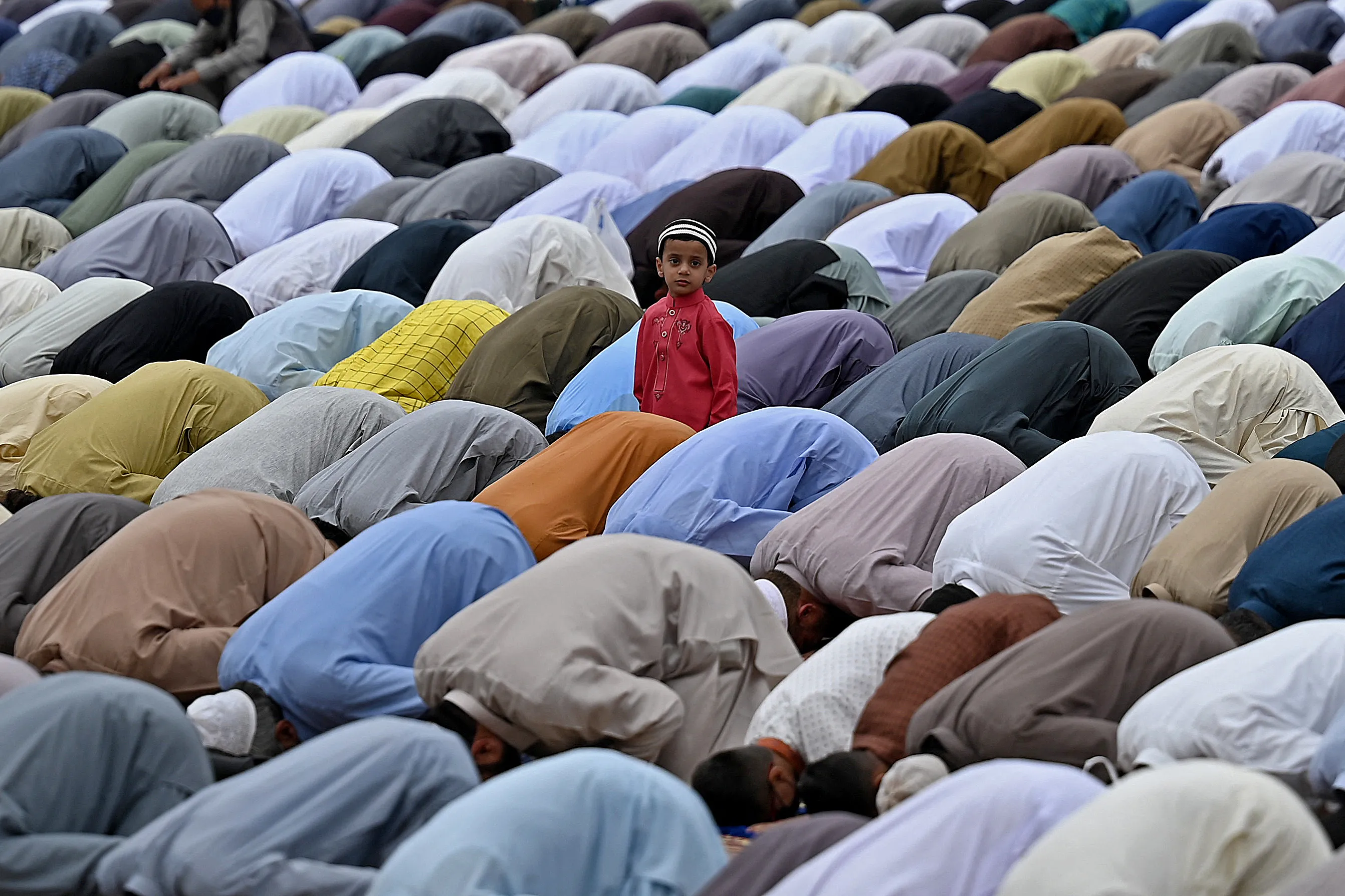 A child looks on as Muslim devotees offer special prayers on the occasion of Eid al-Fitr that marks the end of the holy month of Ramadan at Eidgah Sharif shrine in Rawalpindi on May 13, 2021. (Photo by Aamir Qureshi/AFP Photo)