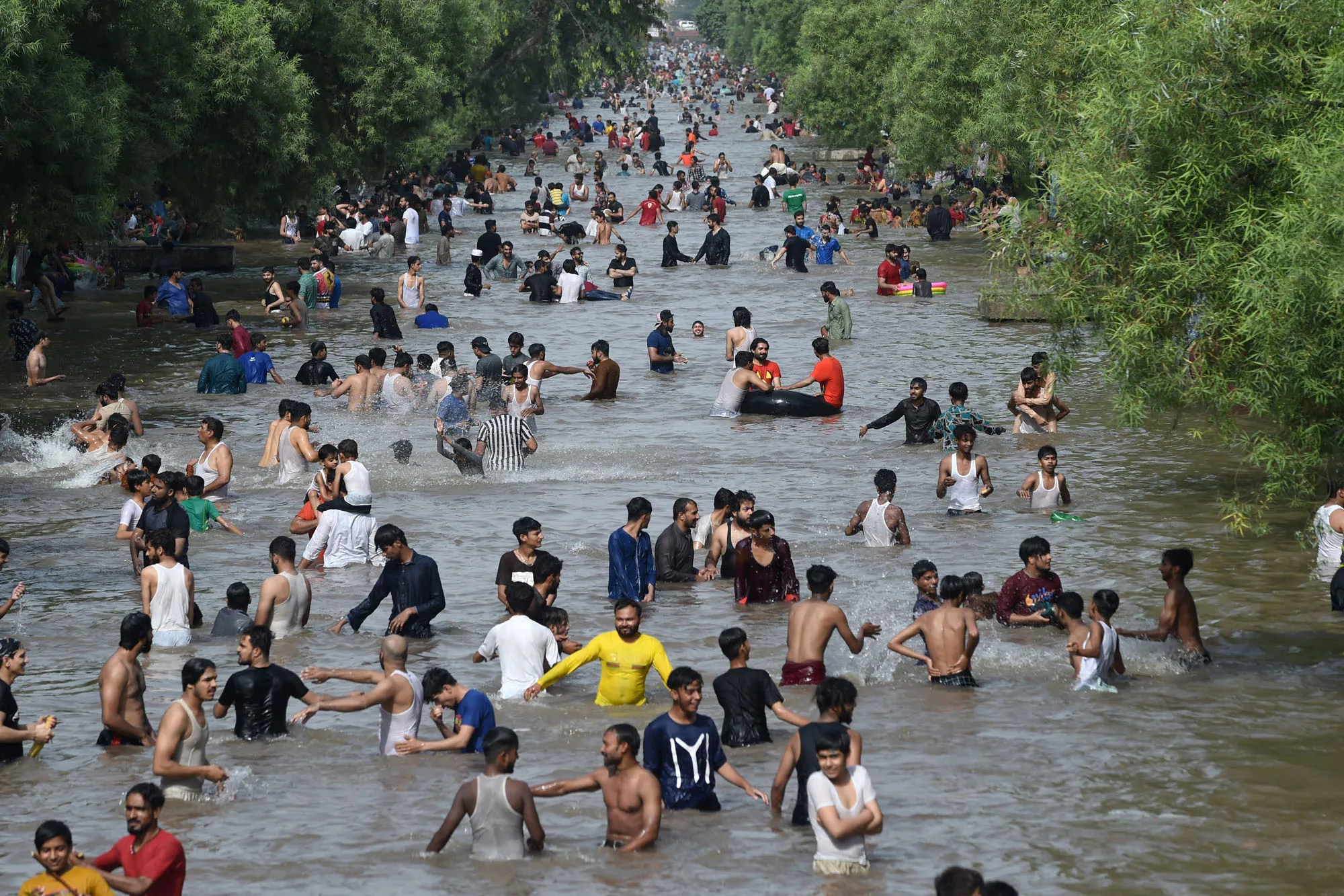 People cool themselves in a canal a hot summer day in Lahore on May 30, 2021. (Photo by Arif Ali/AFPPhoto)