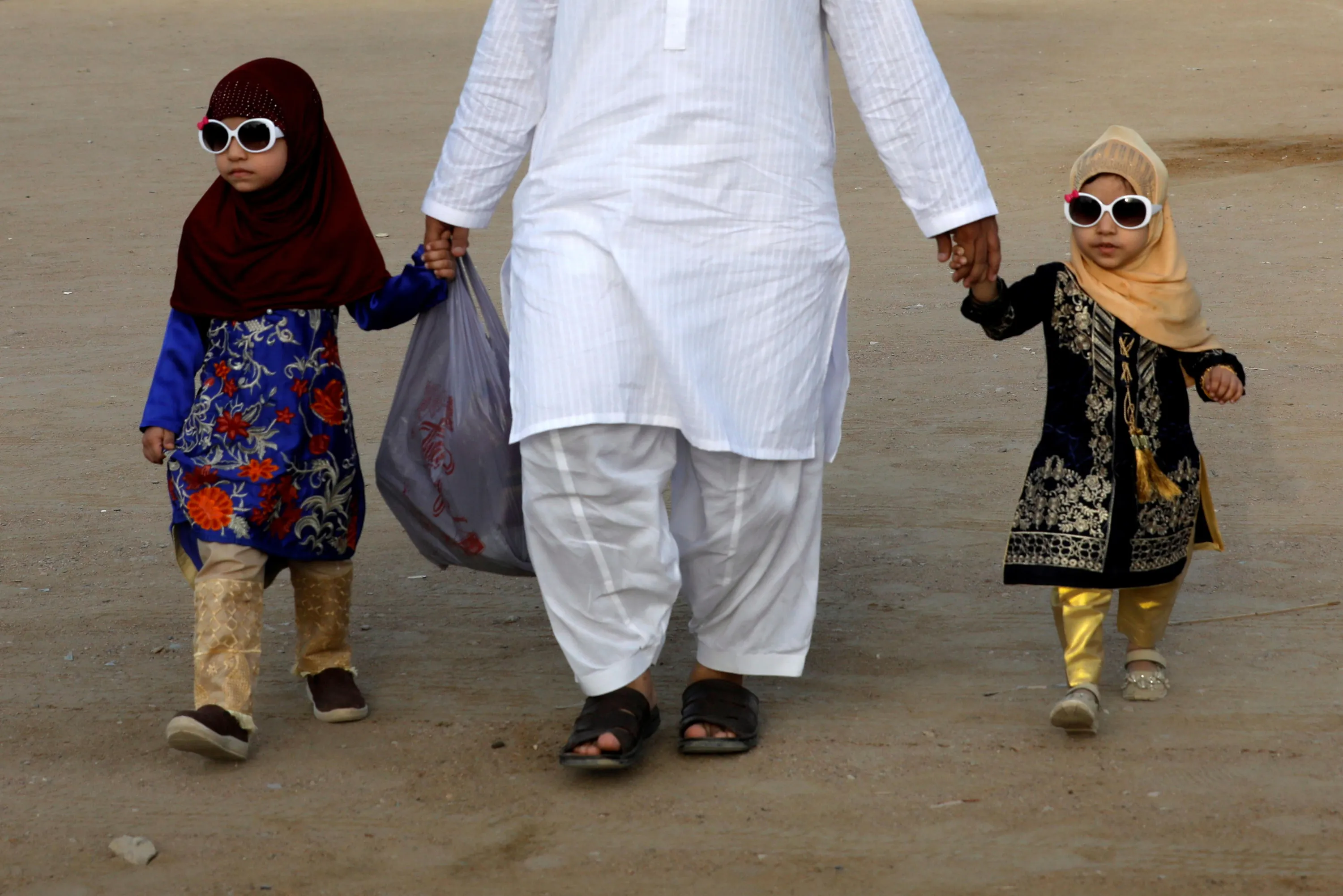 Siblings along with their father walk after celebrating Eid al-Fitr prayers to mark the end of the holy fasting month of Ramadan, as the outbreak of the coronavirus disease (COVID-19) continues in Karachi, Pakistan on May 13, 2021. (Photo by Akhtar Soomro/Reuters)