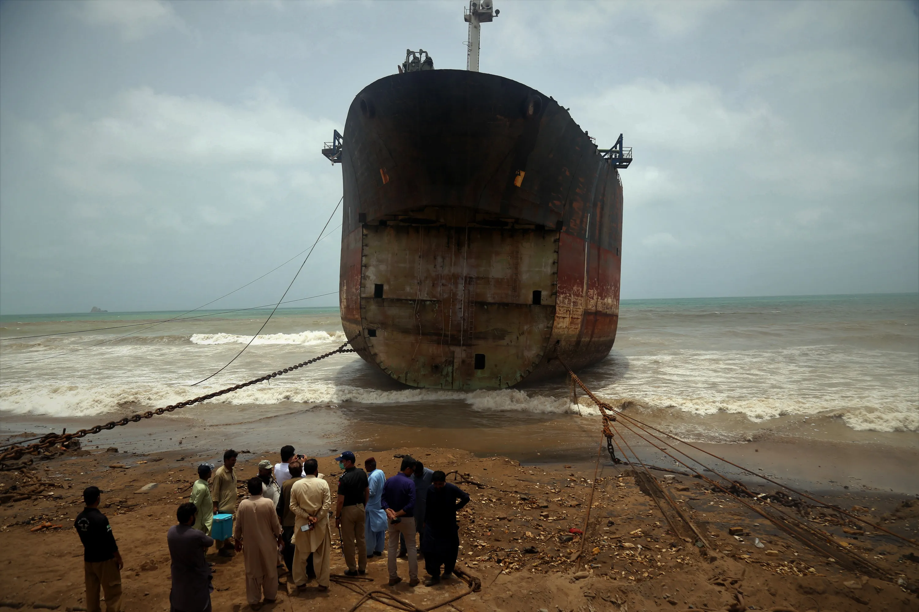 People stand next to a ship, containing tonnes of hazardous mercury-mixed oil, as it was allowed to anchor at Gadani ship-breaking yard in Gadani, Pakistan, 28 May 2021. Authorities have launched an investigation into the anchoring of a ship at the Gadani shipbreaking yard despite Interpol's warning that the ship contains dangerous chemicals. (Photo by Rehan Khan/EPA/EFE)