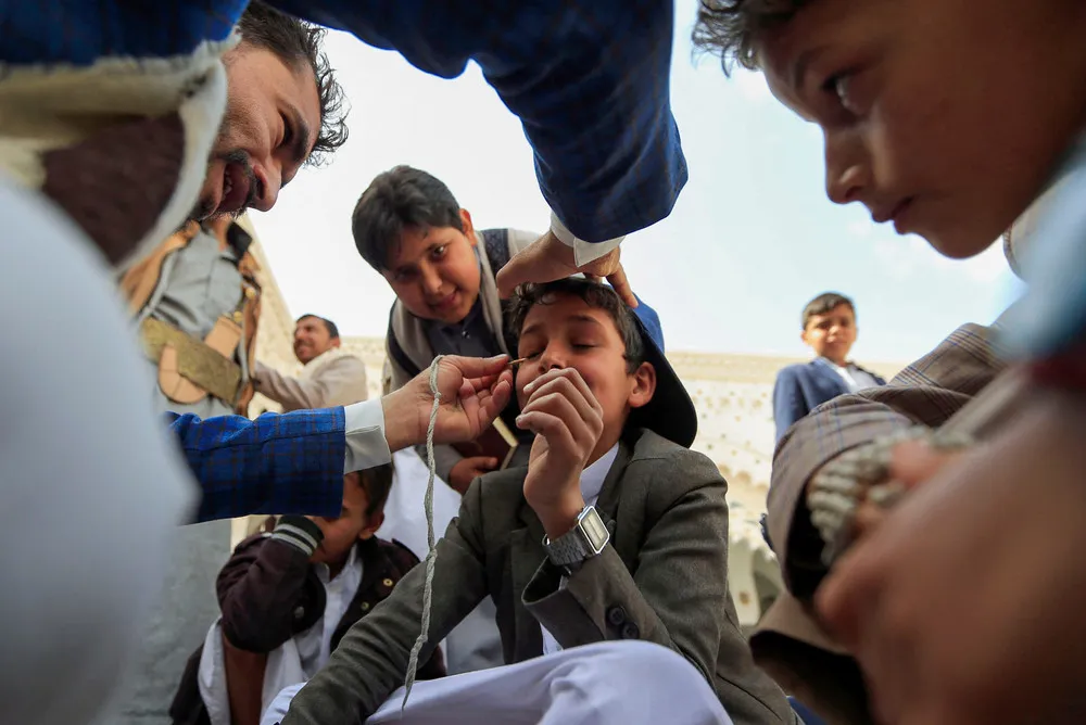 A Yemeni man applies traditional Kohl eyeliner to a youth's eyelid at the Mosque of Sanaa during the Muslim fasting month of Ramadan, on April 16, 2021. (Photo by Mohammed Huwais/AFP Photo)