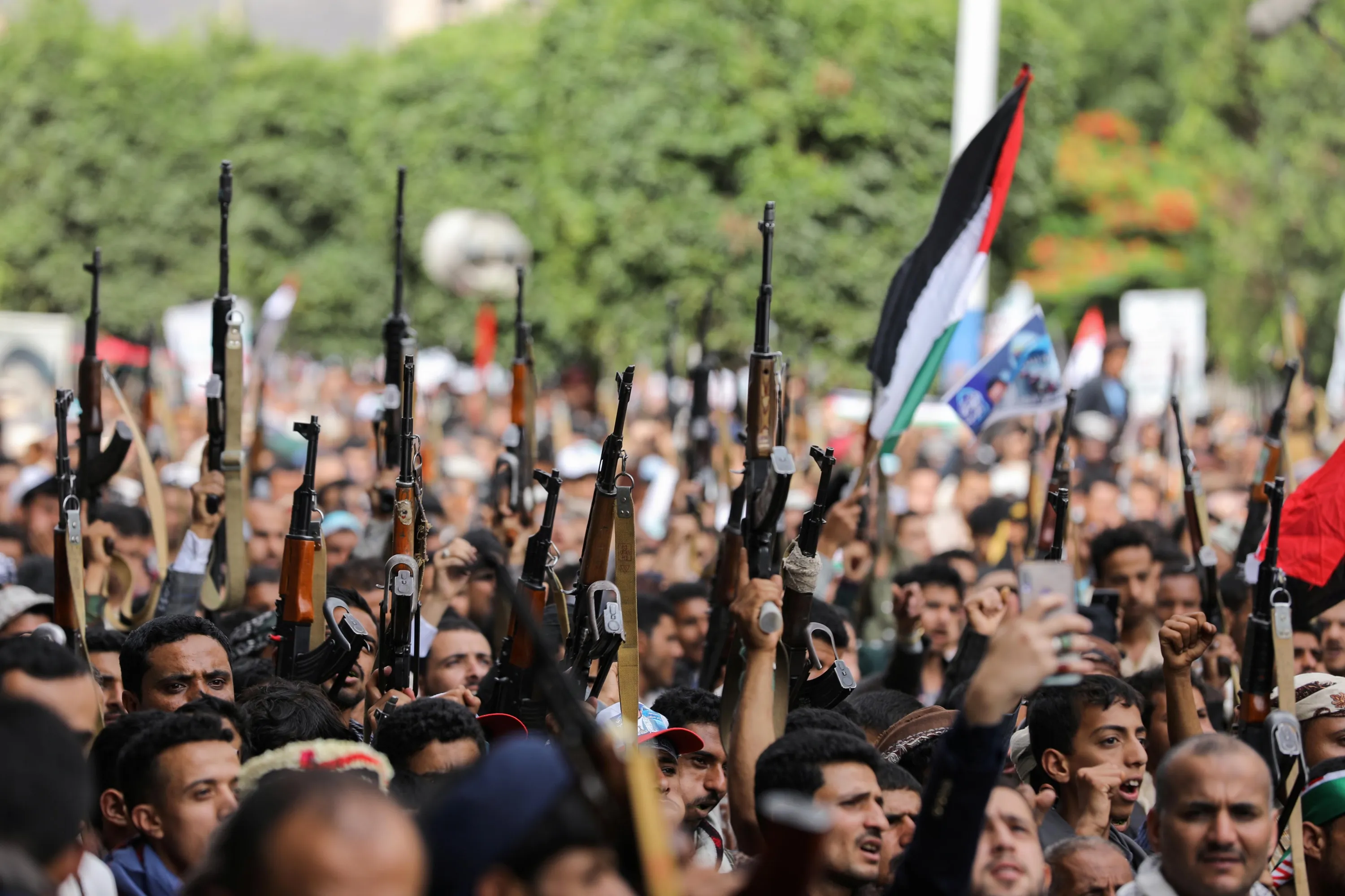 People hold up their weapons during a protest to express solidarity with the Palestinian people amid a flare-up of Israeli-Palestinian violence, in Sanaa, Yemen on May 17, 2021. (Photo by Khaled Abdullah/Reuters)