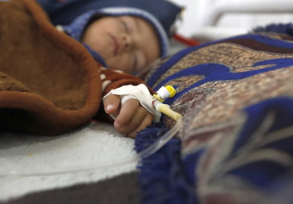 A Yemeni child infected with measles gets medical treatment at a hospital amid a measles outbreak, in Sana'a, Yemen, 21 March 2021. Local health authorities has said that Al-Sabeen Child Hospital in Sana’a has received at least 28 children infected with measles over the past week, two of whom died, amid a rapidly spreading measles outbreak which began in 2018 in many provinces of the war-ridden country. (Photo by Yahya Arhab/EPA/EFE)