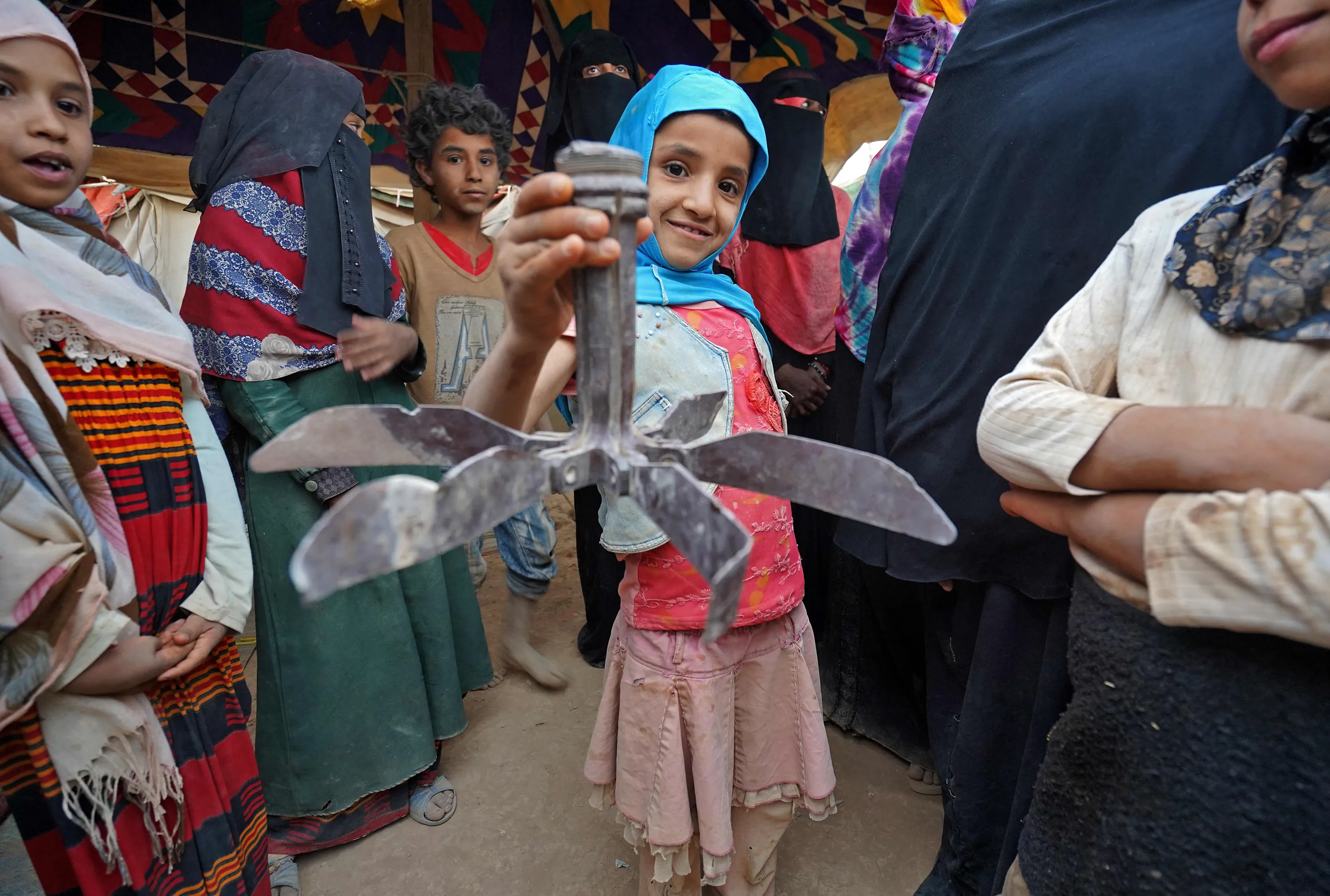 A girl holds propeller debris as she stands near other women and children by tents at the Suweida camp for people internally displaced by conflict, near Yemen's northern city of Marib, on April 15, 2021. The outcome of the scorched-earth battles raging around Marib city, the Saudi-backed Yemeni government's last northern stronghold, could significantly alter the future course of Yemen's conflict, now in its seventh year. The loss of Marib, gripped by a worsening humanitarian crisis, would be a heavy blow to the government, giving the Iran-aligned rebels more leverage in any future negotiations or even spur them to push further south, observers say. (Photo by Nabil Alawzari/AFP Photo)