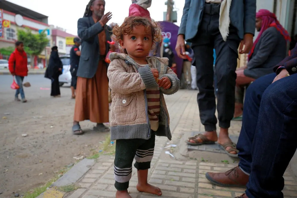 A girl waits with her father to receive a meal from the Wajba (meal) initiative during the holy month of Ramadan in Sanaa, Yemen on April 22, 2021. (Photo by Nusaibah Aluaalemi/Reuters)