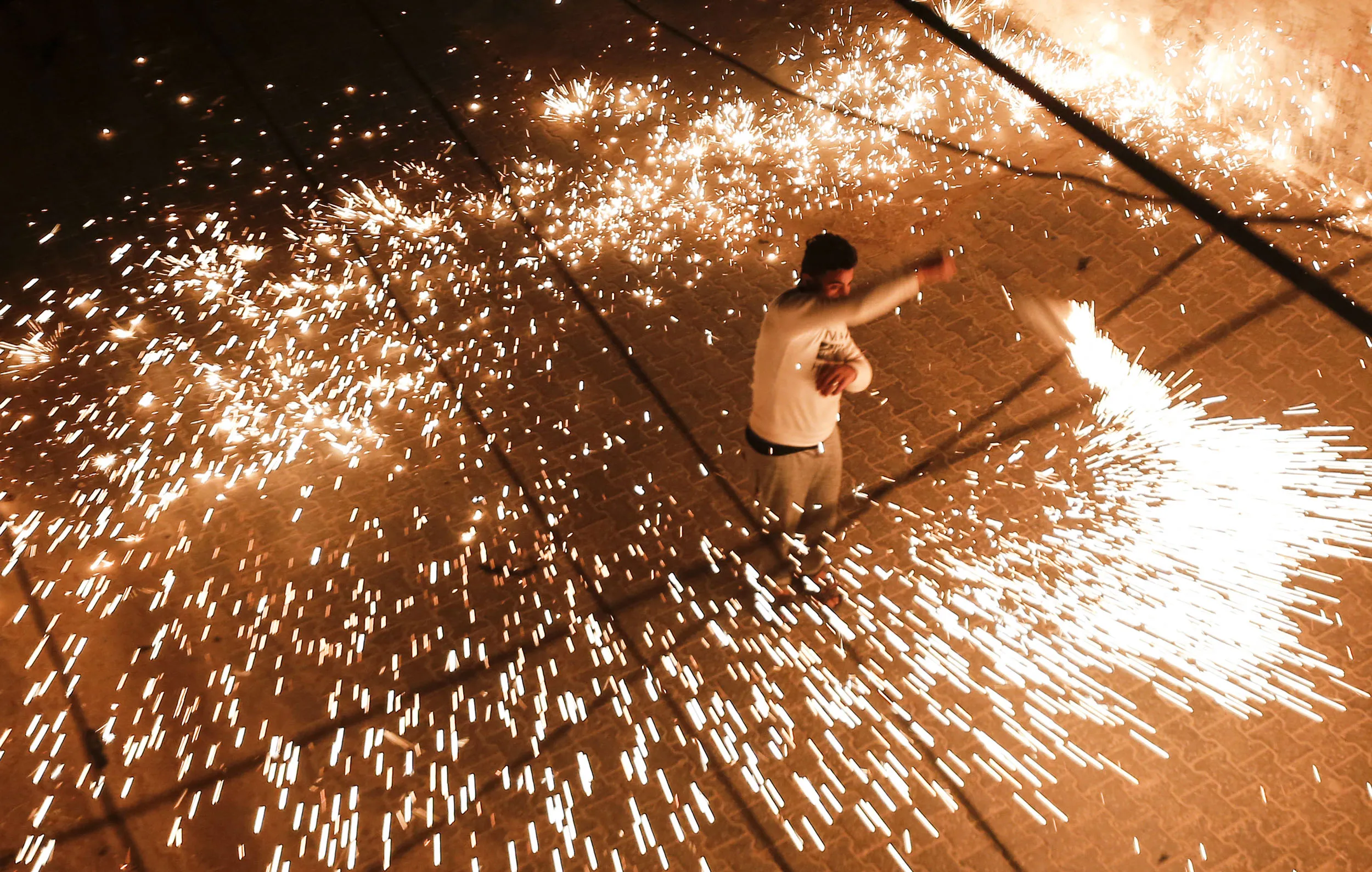 A Palestinian youth swings a homemade fireworks sparkler, as people celebrate on the night ahead of the Muslim holy fasting month of Ramadan, in Gaza City on April 11, 2021. (Photo by Mahmud Hams/AFP Photo)