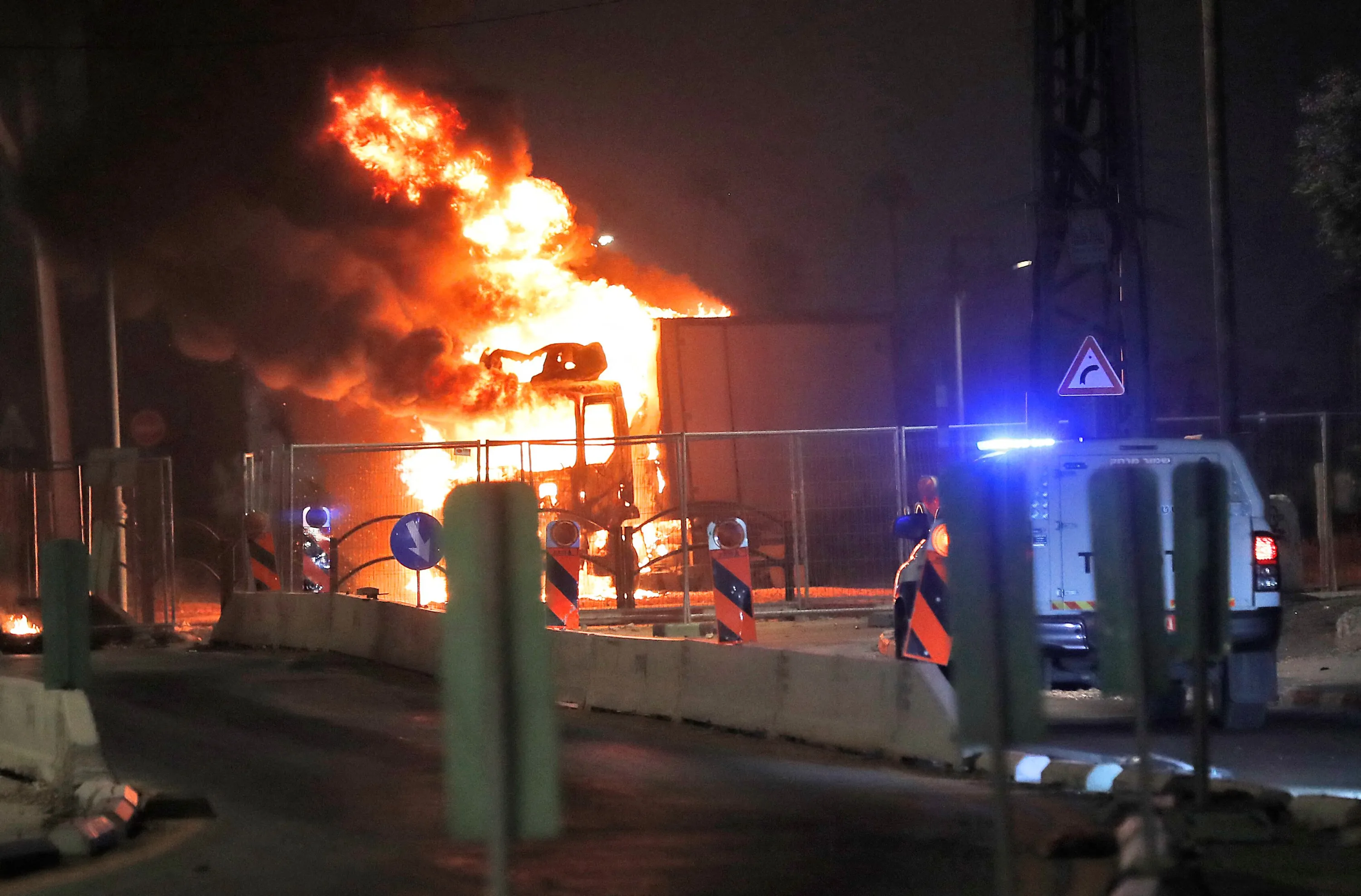 A truck burns at the entrance of the mixed Jewish-Arab city of Lod, where a state of emergency has been declared following civil unrest, on May 12, 2021. Israeli Prime Minister Benjamin Netanyahu declared a state of emergency in Lod, where police said “wide-scale riots erupted among some of the Arab residents”, and authorities later imposed an overnight curfew there. (Photo by Ahmad Gharabli/AFP Photo)
