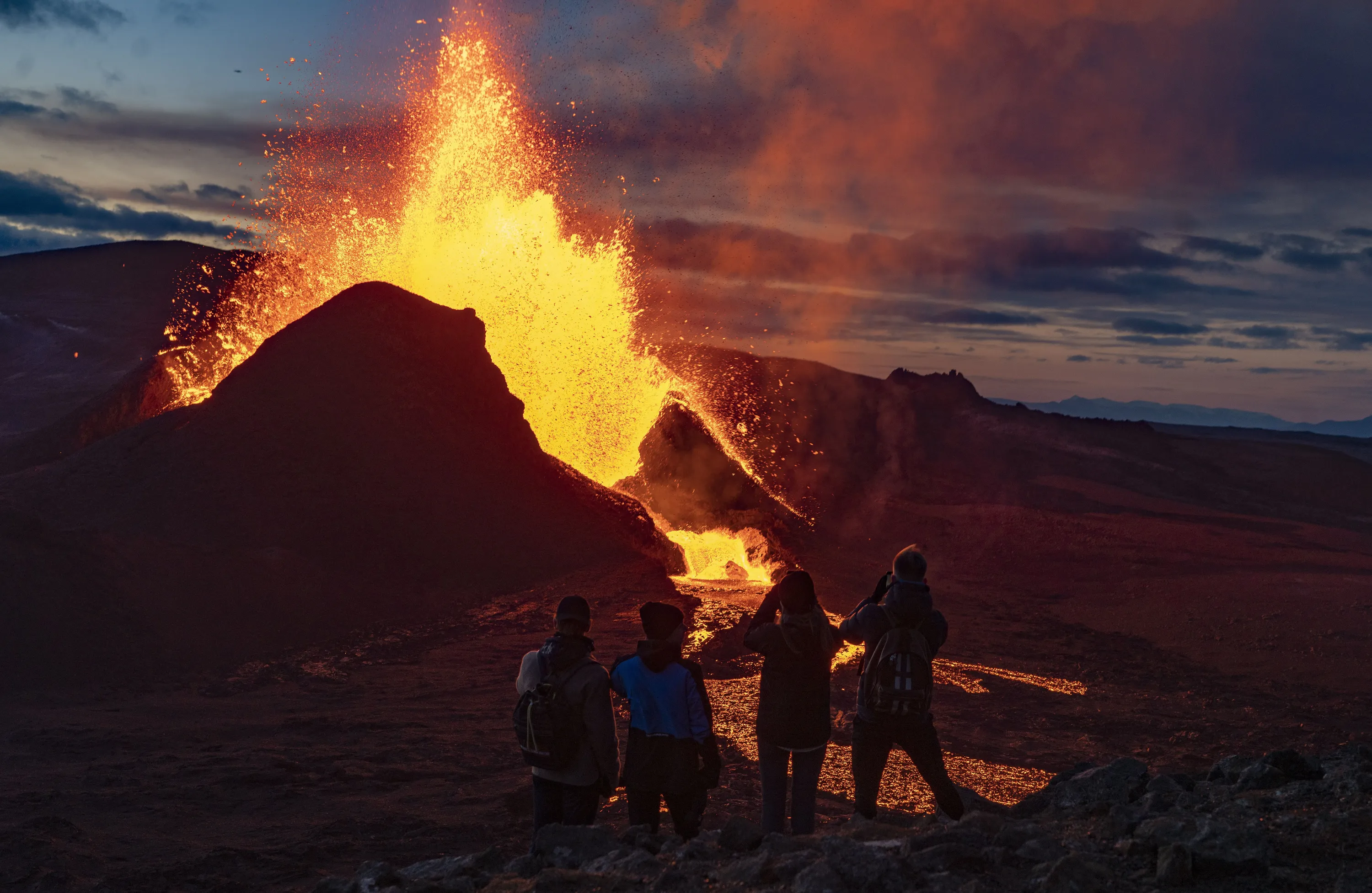 People watch as lava flows from an eruption of the Fagradalsfjall volcano on the Reykjanes Peninsula in southwestern Iceland on Wednesday, May 12, 2021. The glow from the bubbling hot lava spewing out of the Fagradalsfjall volcano can be seen from the outskirts of Iceland's capital, Reykjavík, which is about 32 kilometers (20 miles) away. Pandemic or no pandemic, the world will never stand still. That's perhaps no clearer than in Iceland where the Fagradalsfjall volcano has awoken from a slumber that has lasted 6,000 years, give or take a year or two. (Photo by Miguel Morenatti/AP Photo)