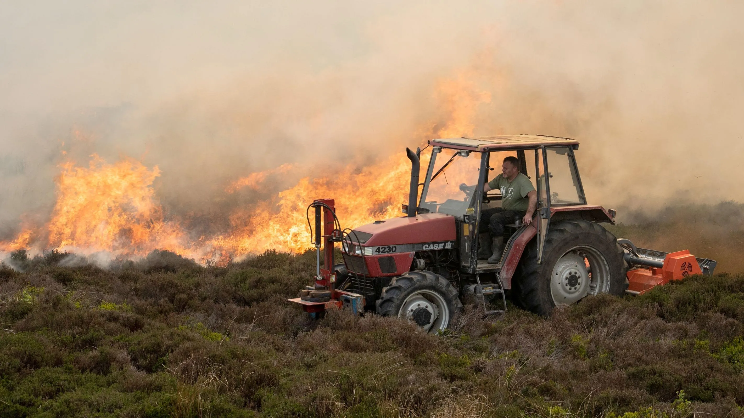 A farmer attempts to create a firebreak through heather and gorse as a wildfire rages across the hills of the Clwydian Range, above the village of Rhewl, Llangollen, on June 1, 2021 in North Wales, United Kingdom. Wales saw its wettest May on record, but with a dry and sunny Bank Holiday weekend, the fire spread quickly over the moorland. (Photo by Phil Hatcher-Moore/Getty Images)